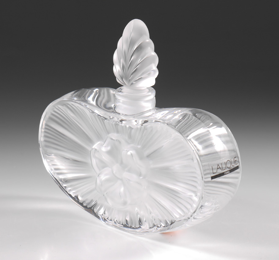 LALIQUE CLARISSE CRYSTAL PERFUME IN ORIGINAL BOX: In Clarisse pattern, 4 3/4'' h. x 5'', in the original fitted box, 2 3/4'' h. x 7 1/4'' x 7 1/4''.