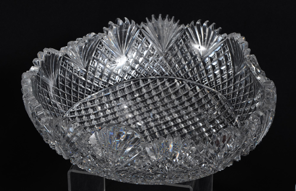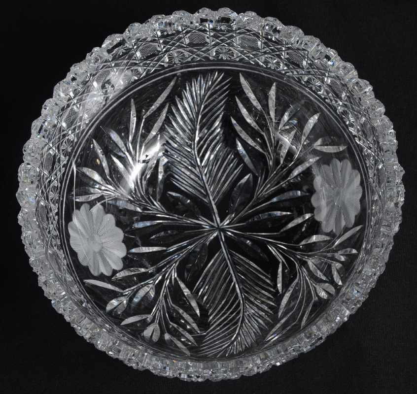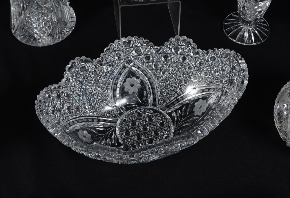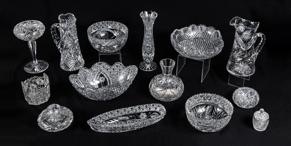 14 PIECE ESTATE COLLECTION OF CUT GLASS: An assembled collection of 14 pieces, no visible marks, largest pitcher 11 1/4'' h. x 6 3/4''; largest bowl 4 3/4'' h. x 12 1/2'' x 8 1/2''; smallest covered sugar 3 3/4'' h. x 2 1/2''.