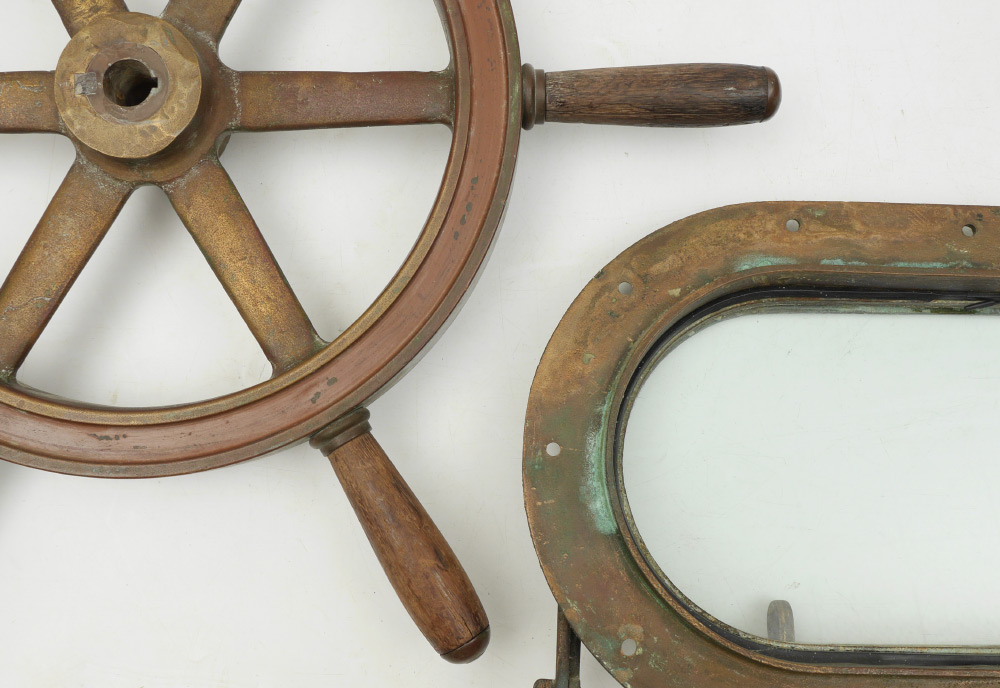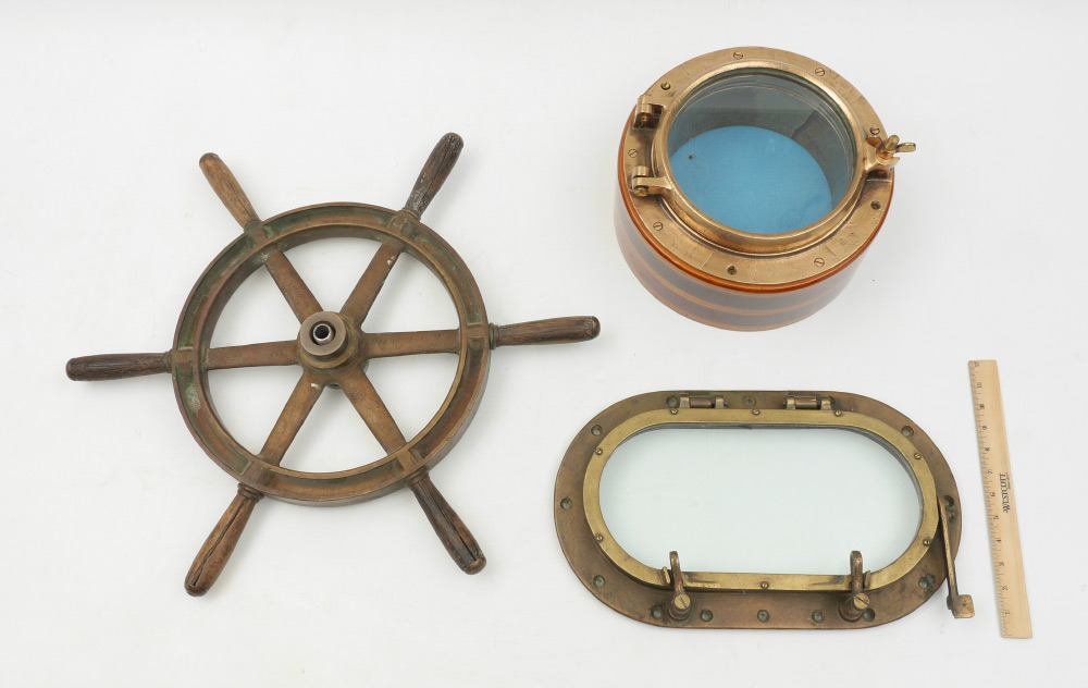 MARITIME LOT OF PORTHOLES & SMALL SHIPS WHEEL: 3 pieces total to include 1) Oval porthole, 17 1/4'' x 10 1/4'' x 1 1/2''. 2) Round port hole converted to display box, 7 1/2'' h. x 12'' dia. 3)Heavy cast metal ships wheel with wood handles, 24 1/4'' h. x 3''.