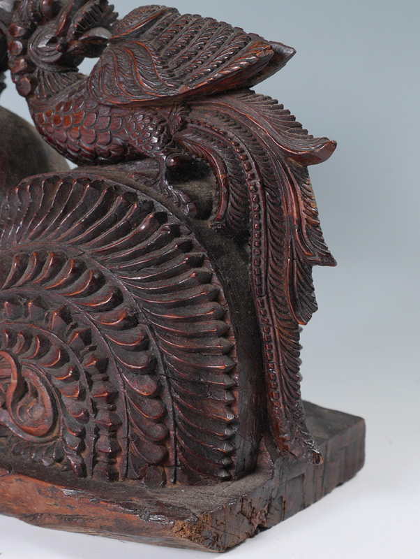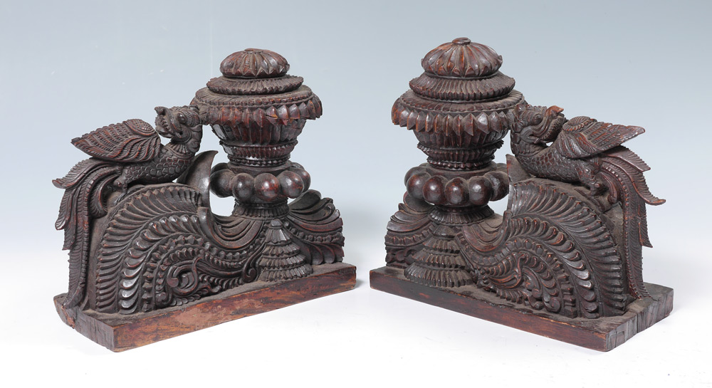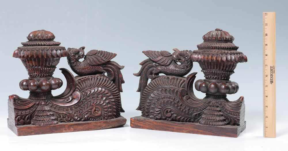 SOUTHEAST ASIAN CARVED DRAGON BOOKENDS: Heavily carved bookends or finials with figural mythological creatures / dragons and architectural designs. Measures 10 3/4'' h. x 12 1/4'' x 5 1/2''.