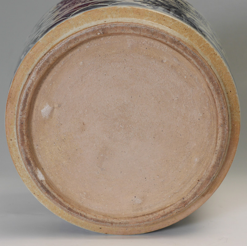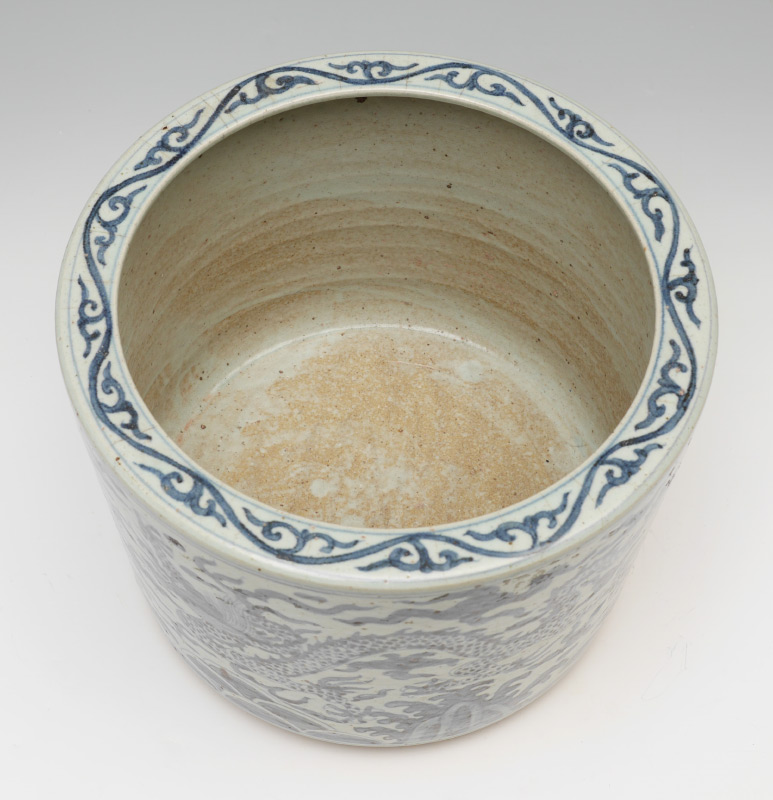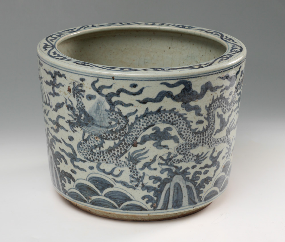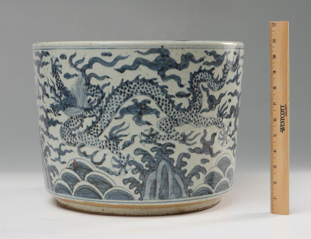BLUE & WHITE DECORATED CHINESE JARDINIERE: Dragon in clouds flying above mountains motif exterior sides, rim with lip, unglazed base, no marks. Overall measures 11'' h. x 14 1/2''.
