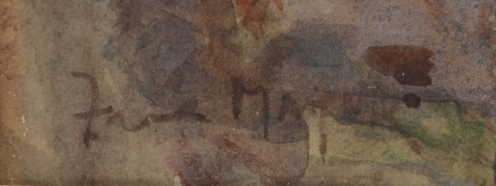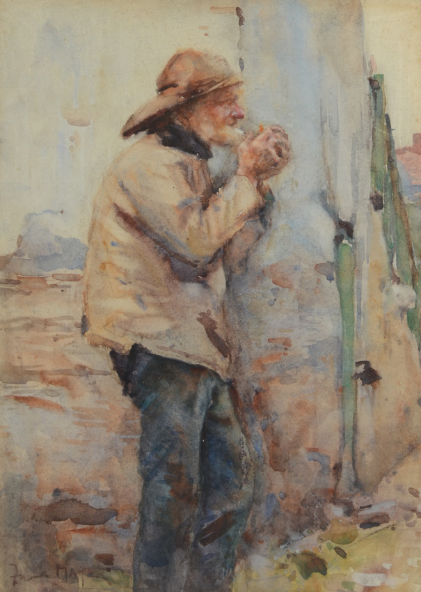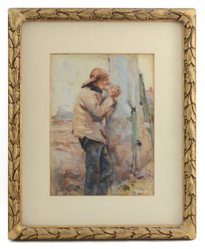 FRANK MAYER? PAINTING OF OLD FISHERMAN SMOKING: Watercolor, sight size 13'' x 9.25'', acanthus leaf gilded gesso frame with overpaint, 21.5'' x 17.5'', signed lower left.