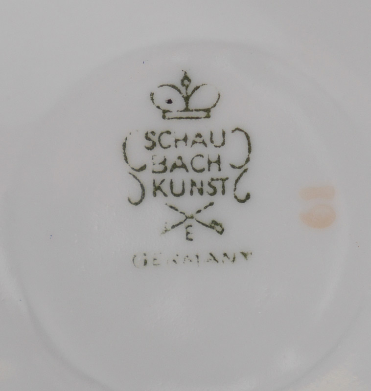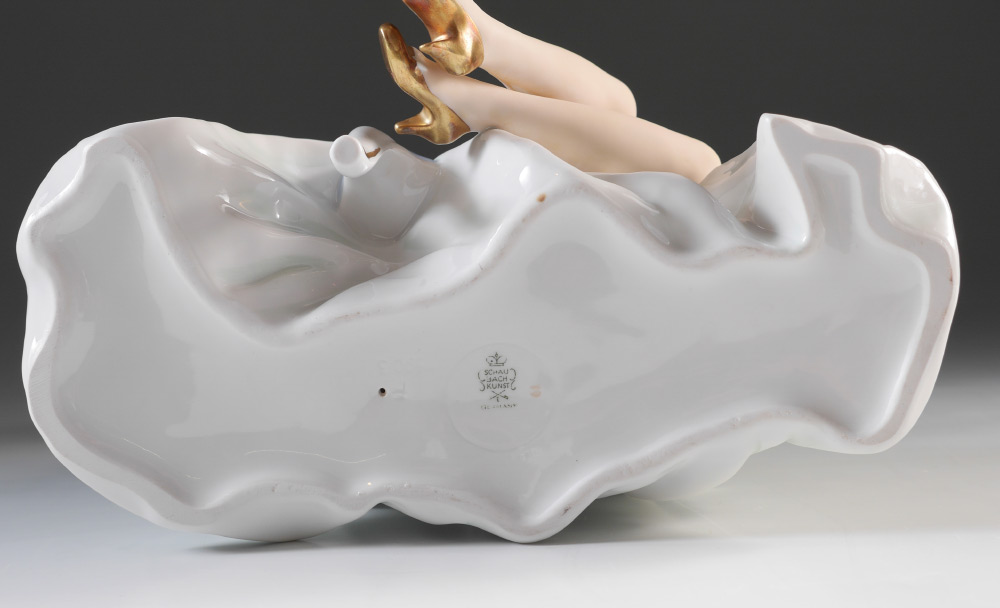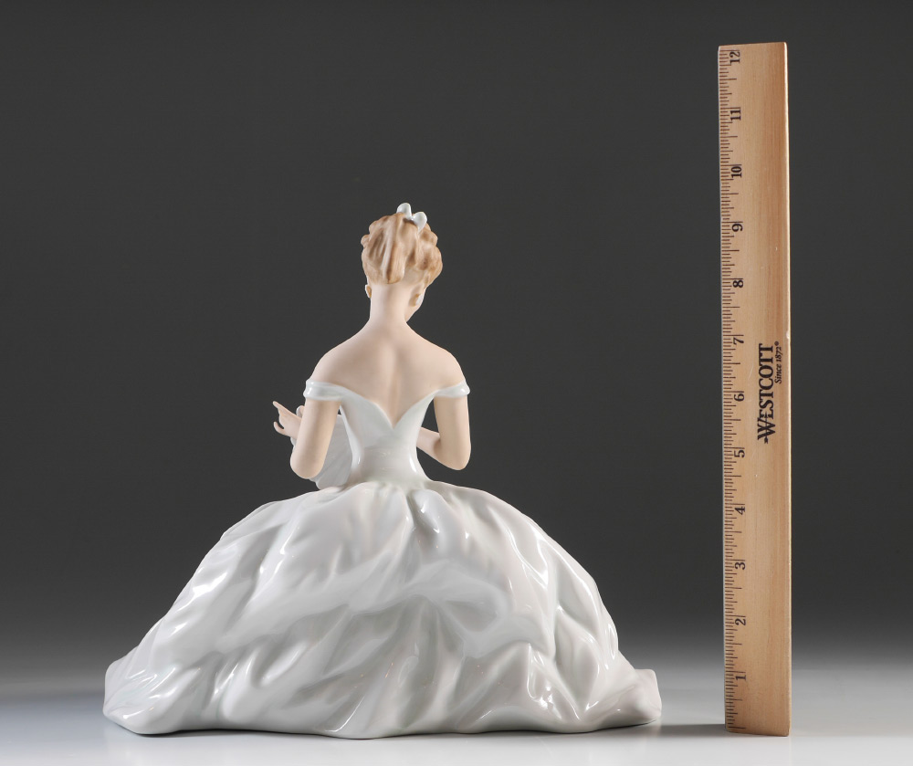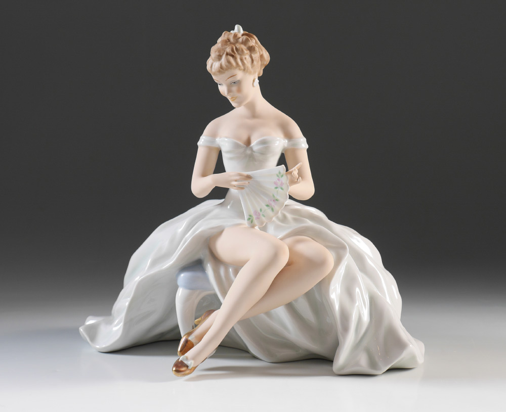 SCHAUBACH-KUNST WALLENDORF PORCELAIN FIGURE: Seated Woman with fan, mark dates to 1953-1958, 10'' h. x 10.5'' x 7.5''.