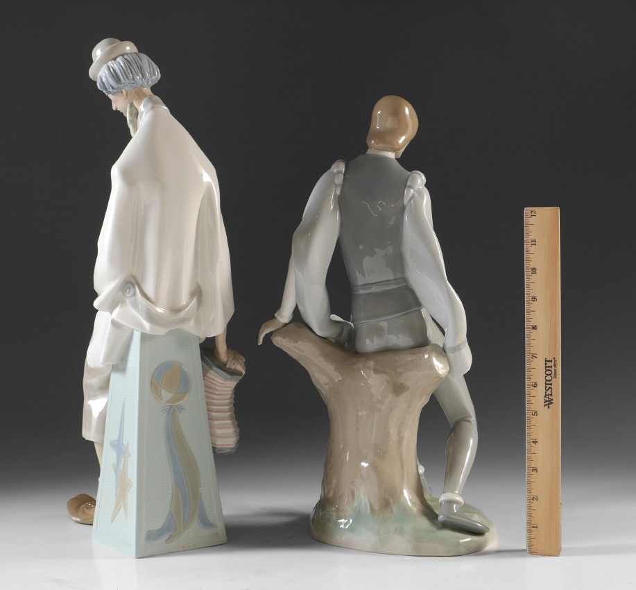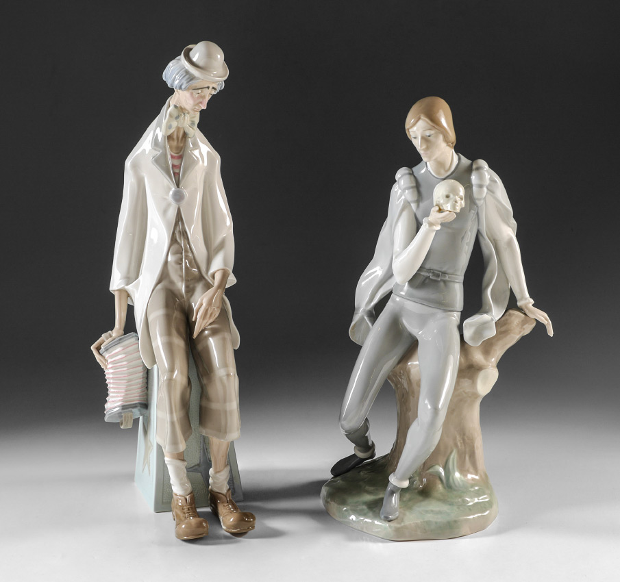 TWO LLADRO PORCELAIN FIGURINES: HAMLET #4729, Alfredo Ruiz sculptor, issued 1970 retired 1980, 16.5'' h. x 9'' x 7.5''. And CLOWN WITH CONCERTINA #1027, Salvador Furio sculptor, issued 1969 retired 1993, 17.75'' h. x 8'' x 6'' approx. Sold as a lot.