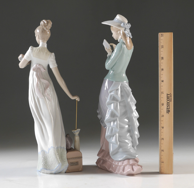 TWO LLADRO PORCELAIN FIGURINES: READING #5000, Francisco Catala sculptor, issued 1978 retired 2002, 14.25'' h. And TRAVELING COMPANIONS #6753, Regino Torrigos sculptor, issued 2001, 13.5'' h. Sold as a lot.