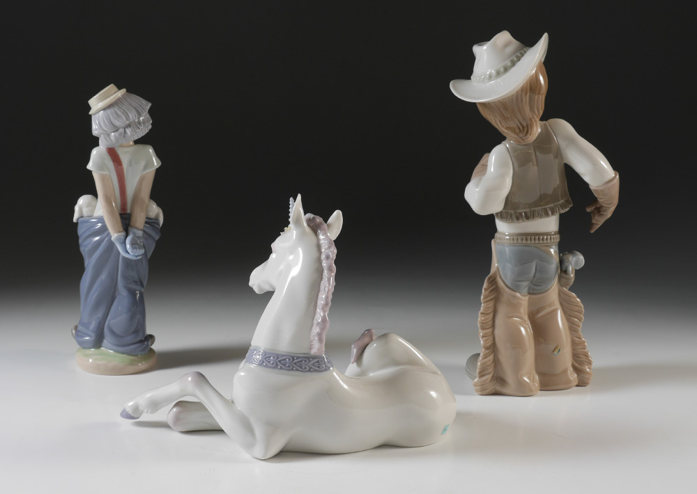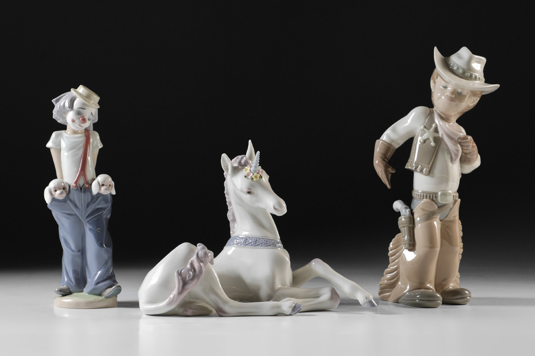 3 LLADRO PORCELAIN FIGURINES: 1) LITTLE PALS #7600 1985 Collectors Society, Juan Huerta sculptor, 8.75'' h. 2) SHERIFF PUPPET #4969, Juan Huerta sculptor, 10.5'' h. 3) LITTLE UNICORN #5826, Jose Luis Alvarez sculptor, 6.5'' x 9''. Sold as a lot.