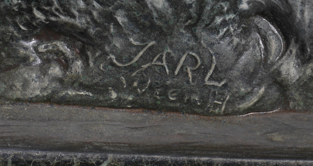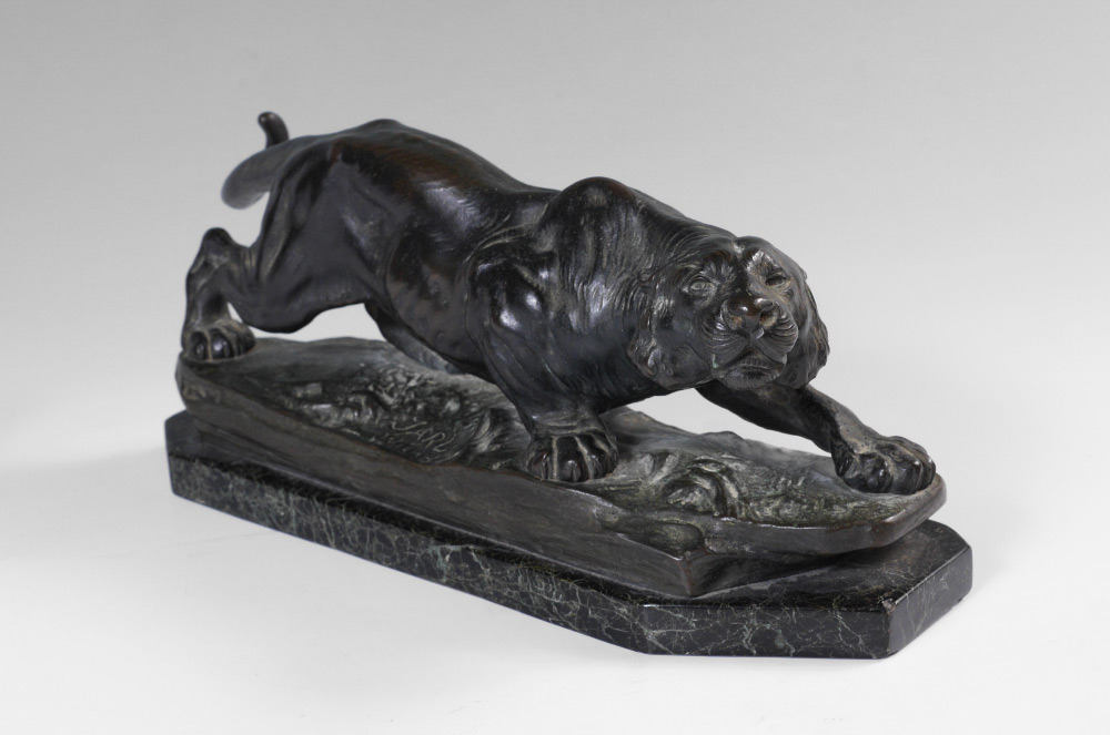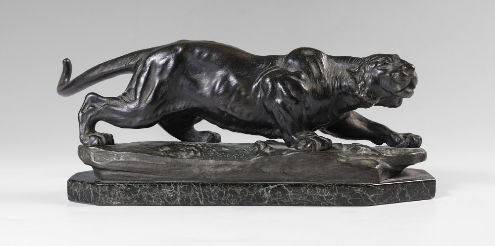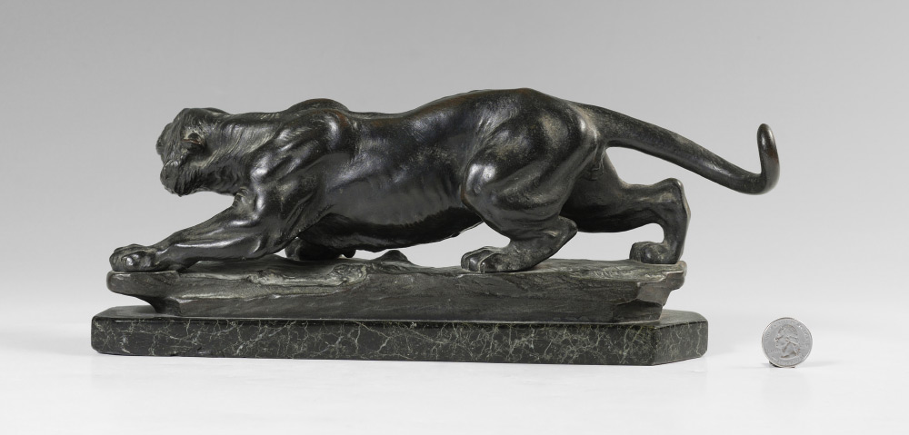 GOOD BRONZE CROUCHING TIGER SIGNED JARL: Incised signature to base of bronze, Jarl, Wien, 4'' h. x 13'' w. x 3.5'' d., affixed to polished variegated green marble plinth, .5'' x 13'' x 3.5''.