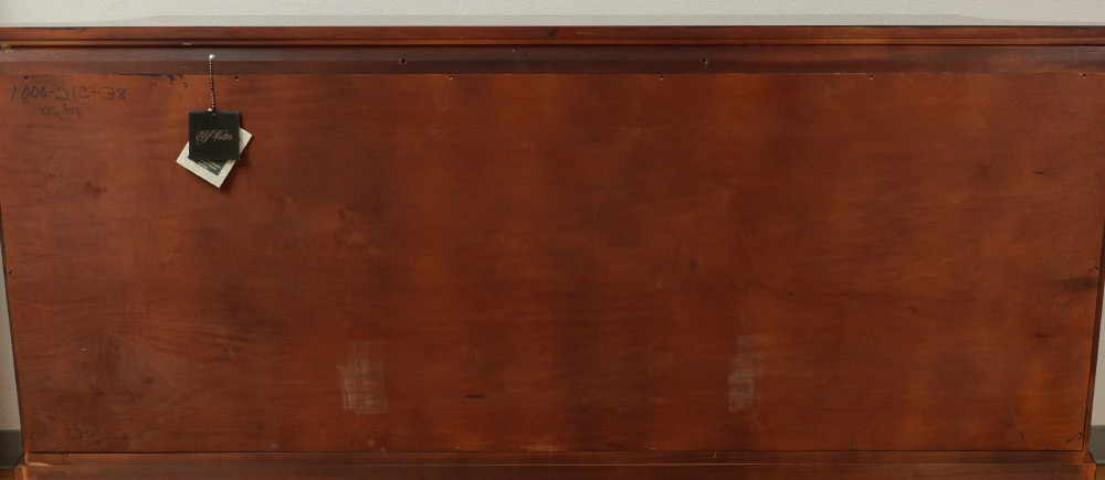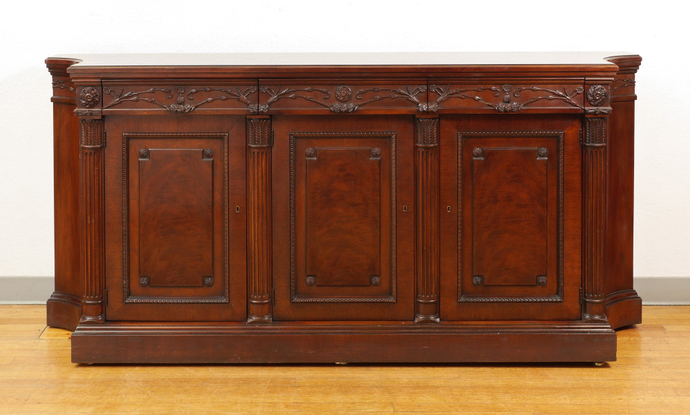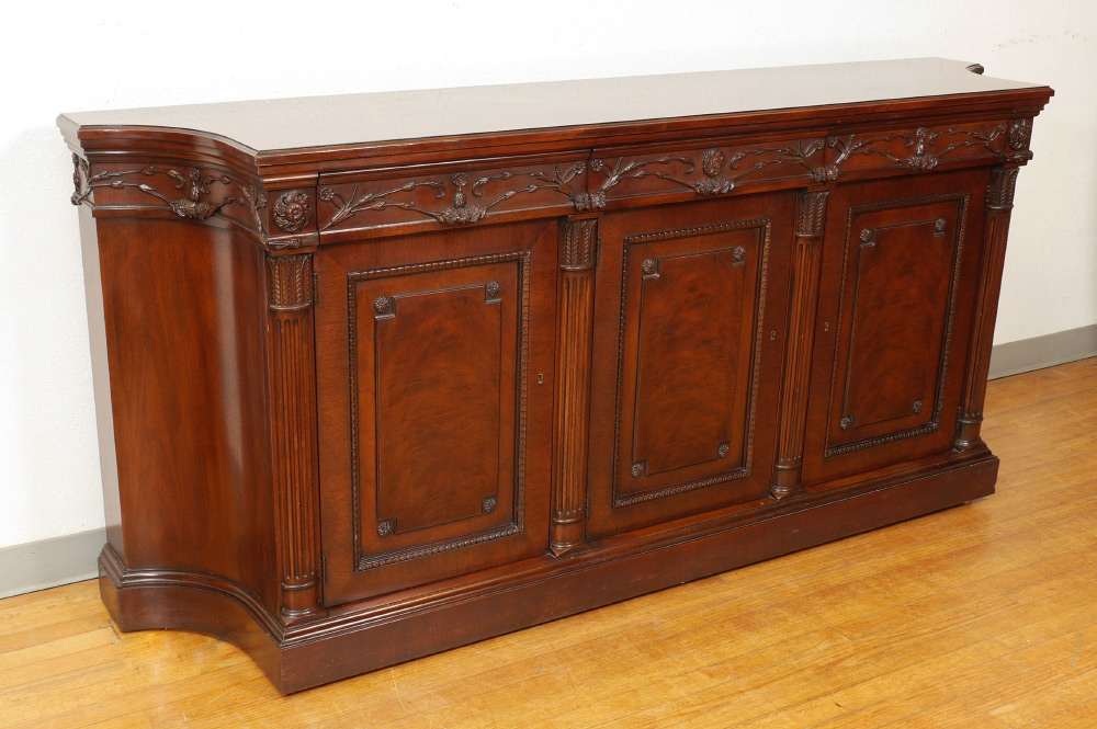 EJ VICTOR NEWPORT HISTORIC COLLECTION INLAID SIDEBOARD: Mahogany veneer, shaped top with parquetry inlay, 3 drawers with carved foliate motif fronts over 3 doors with applied decoration. Makers and collection name inside drawer. Overall measures 37 1/2'' h. x 82 3/4'' x 19 1/4''. For matching sideboard see next lot 1017.