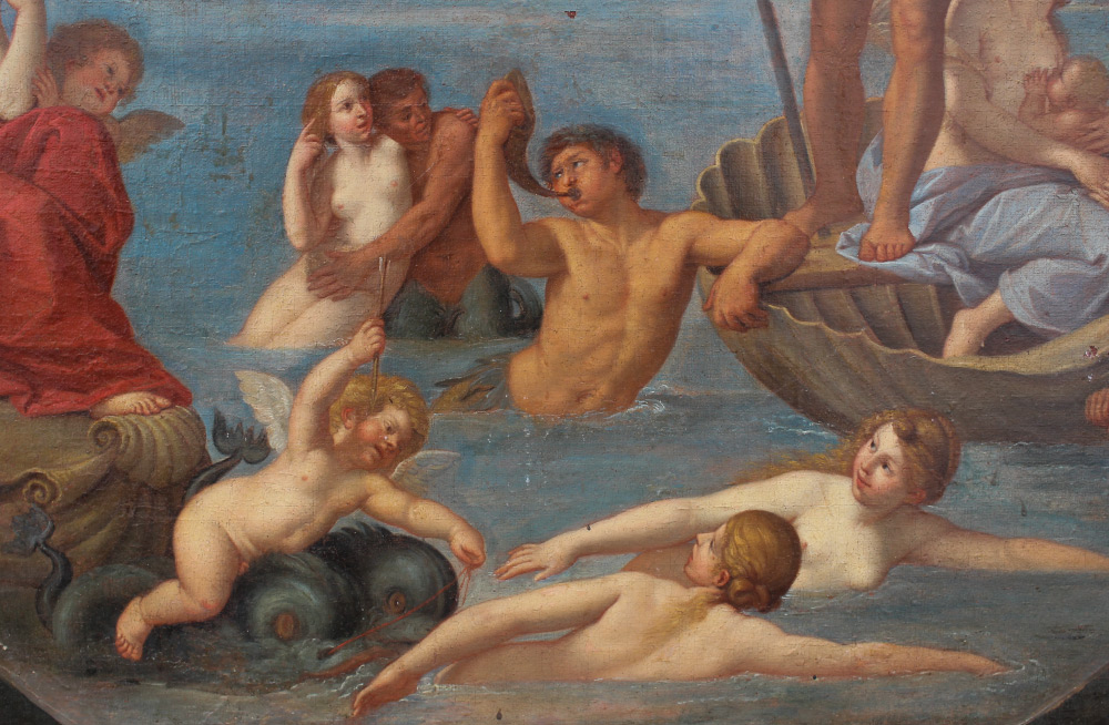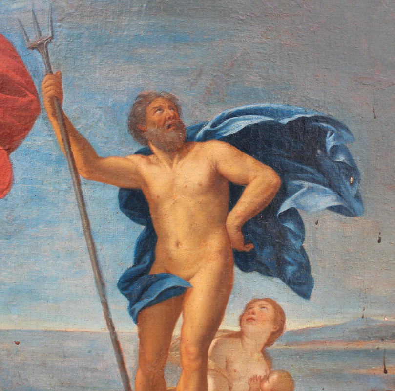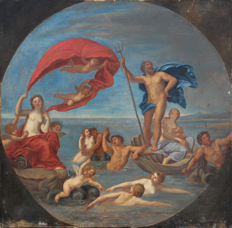 OLD MASTER AFTER ALBANI PAINTING OF NEPTUNE and AMPHITRITE: Oil/Canvas, circular painting stretched on a square stretcher, overall 30.5'' x 30.5'' stretcher size, image size 30.5'' diameter, unframed, faintly marked verso Albani, after the painting on copper titled ''The Maritime Realm: Neptune and Amphitrite'', sold by Christie's for over 1 million dollars.