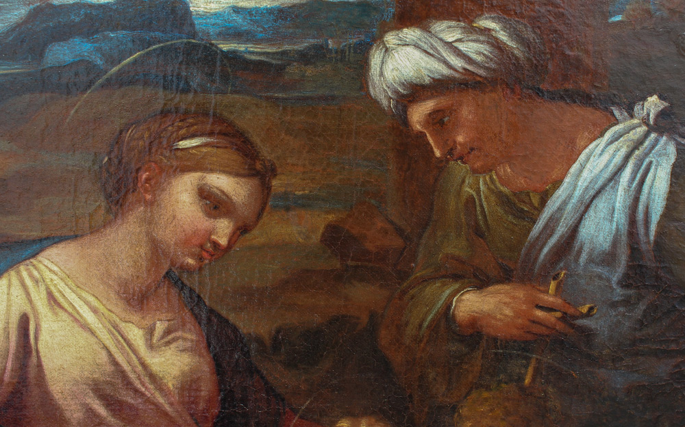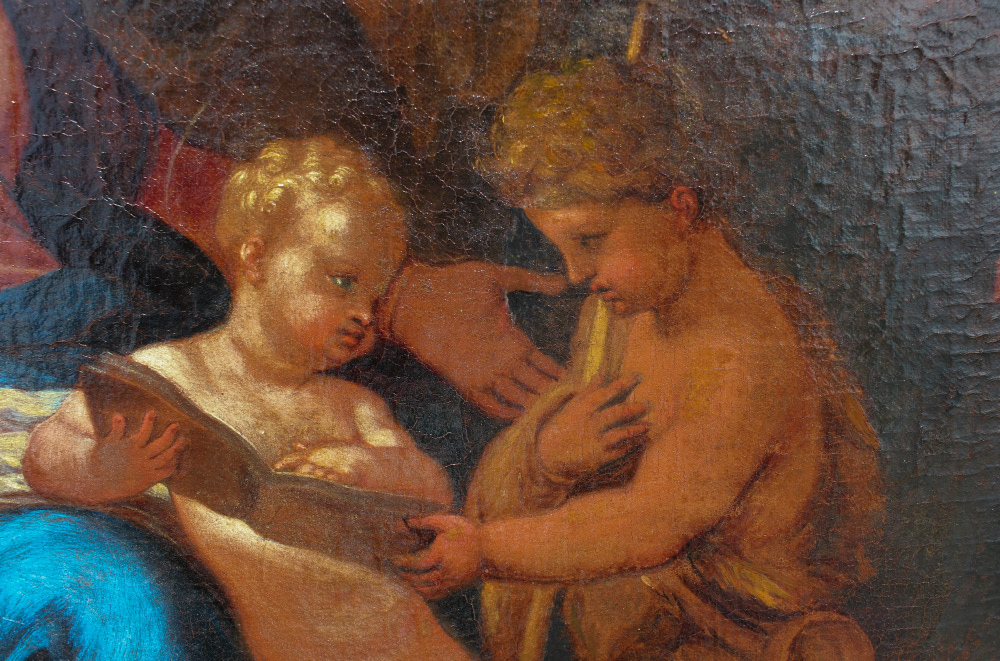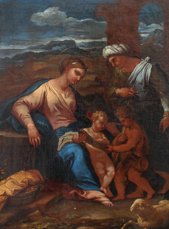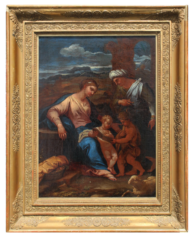 EARLY OLD MASTER STYLE FINE RELIGIOUS OIL ON CANVAS: Scene Depicts Mary, Joseph and the Infant Jesus, Oil/Canvas, 24.5'' x 19'', no visible signature, encased in a heavy European, 19th century gilded and carved frame 33'' x 26.75'' x 2.5''.