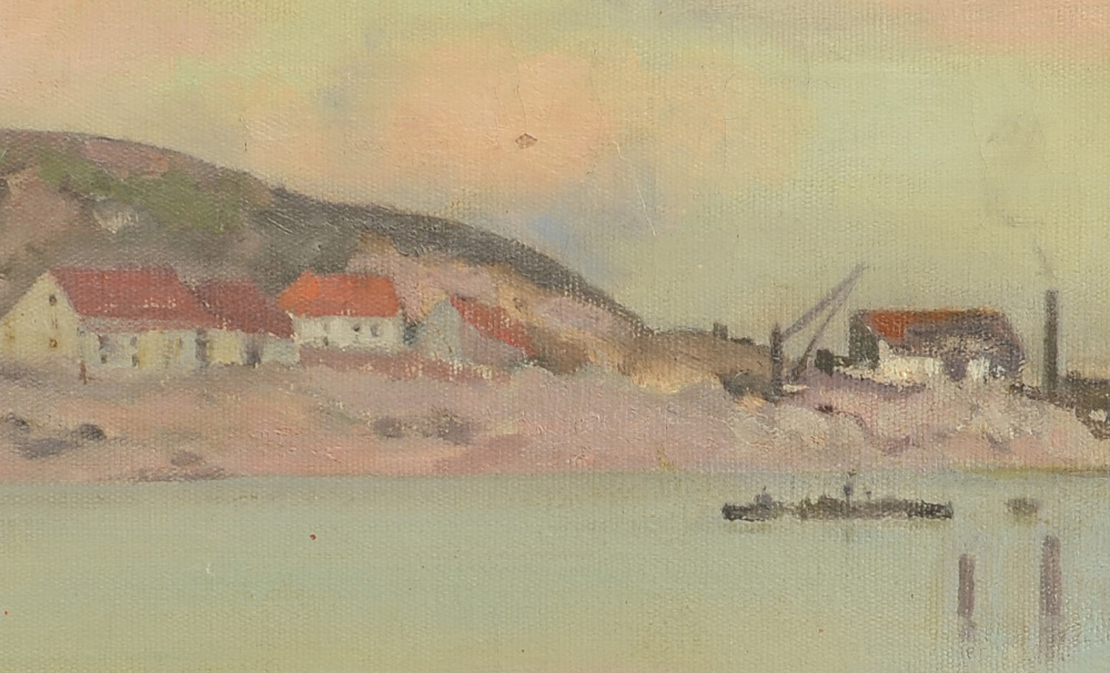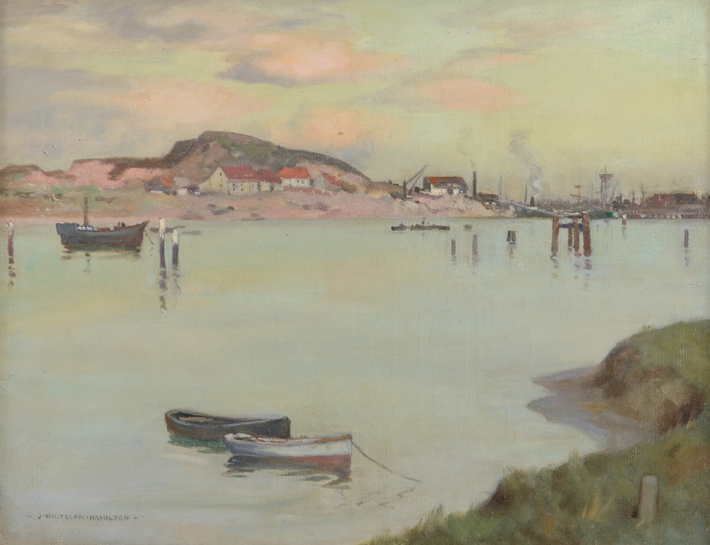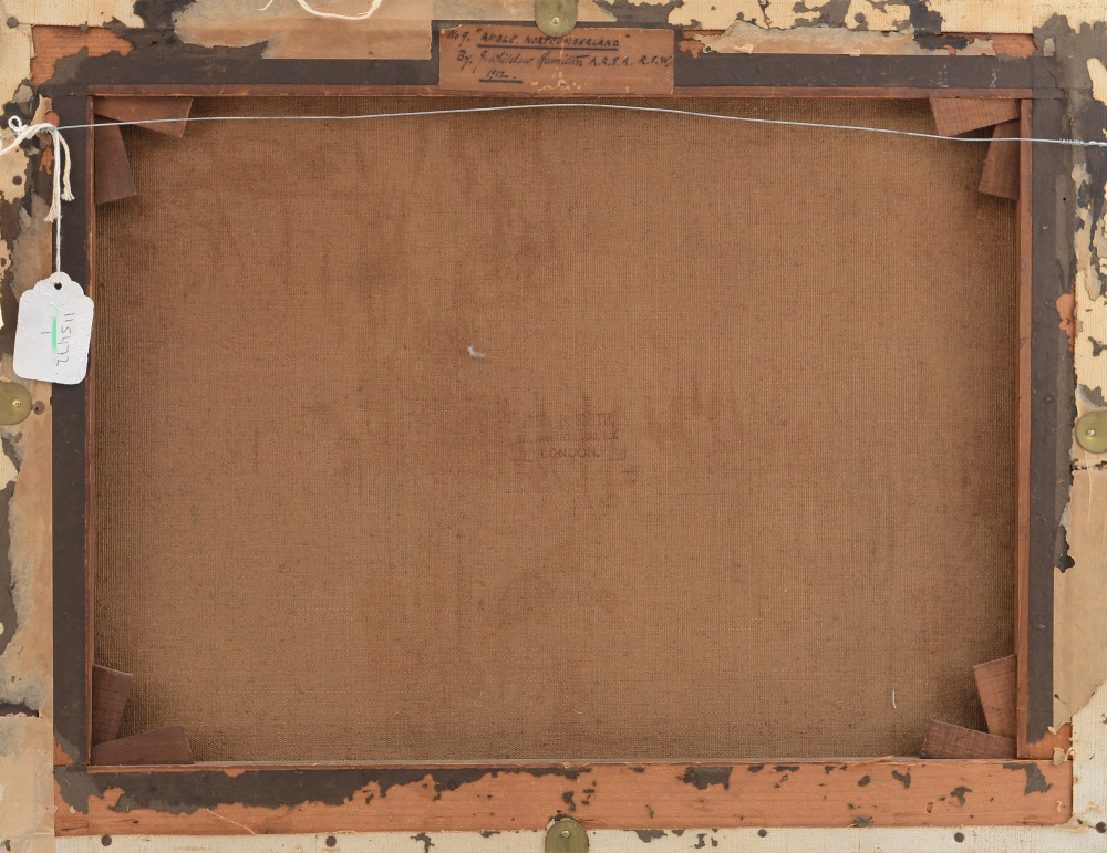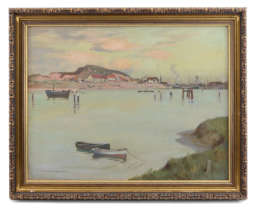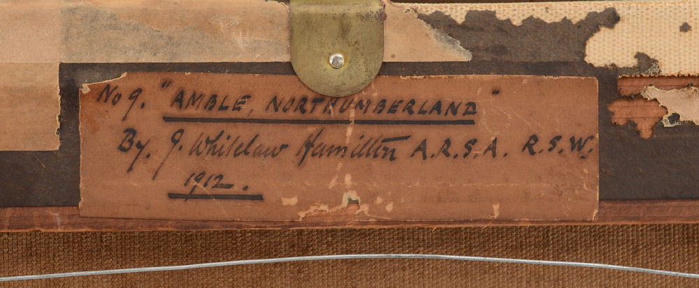 HAMILTON, James Whitelaw, (British, 1860-1932): ''Amble, Northumberland, 1912'', Oil/Canvas, Harbor Scene, 17'' x 22'', original old label affixed verso, signed lower left, encased in gilded frame 20.25'' x 25.25''.