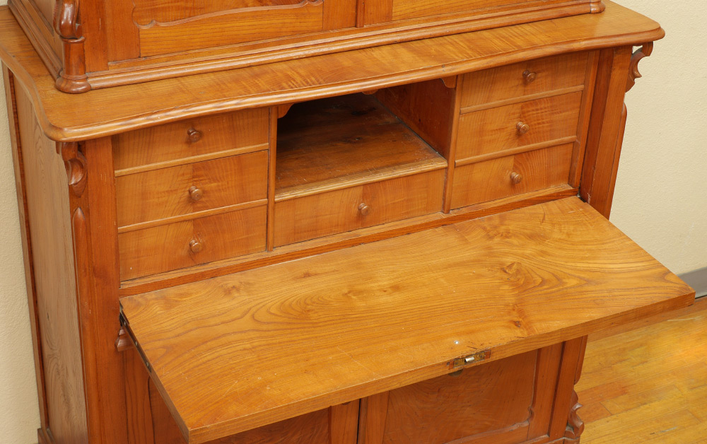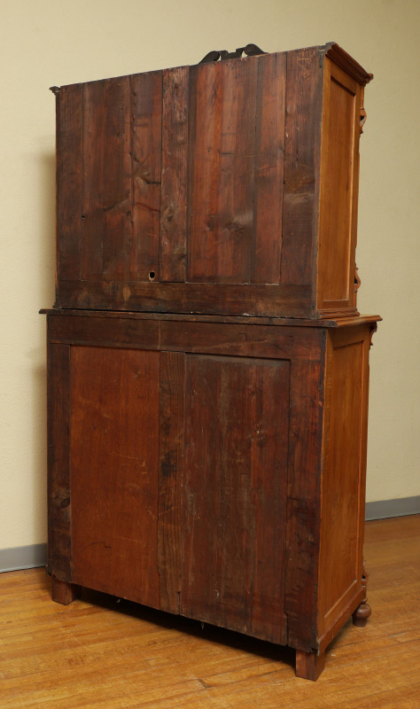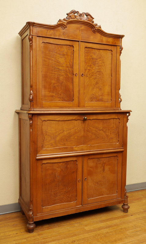 CONTINENTAL CARVED SECRETARY BOOKCASE: Carved crest over 2 blind doors, canted corners with carved decoration. Base with drop front secretary with 7 internal drawers and open shelf over 2 doors, matching decoration, turned front legs. Overall measures 84 3/4'' h. x 47 1/4'' x 21 3/4''.