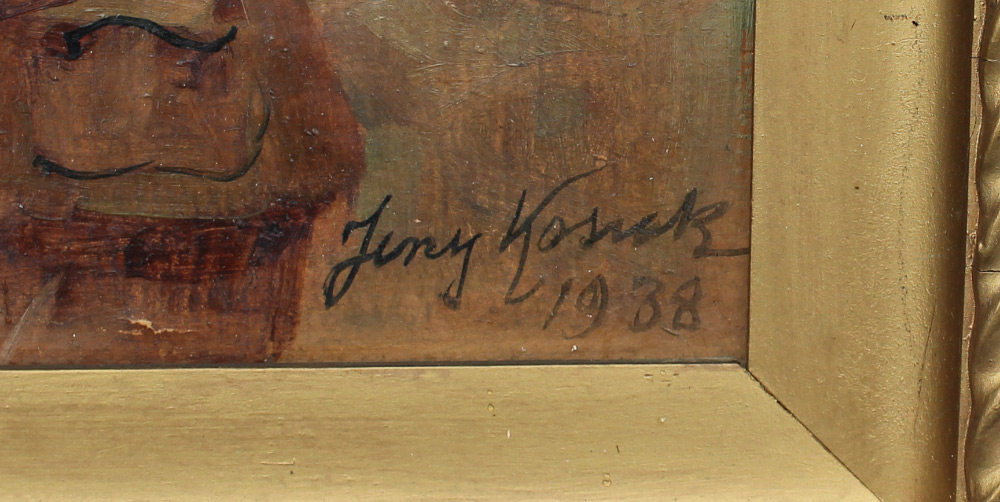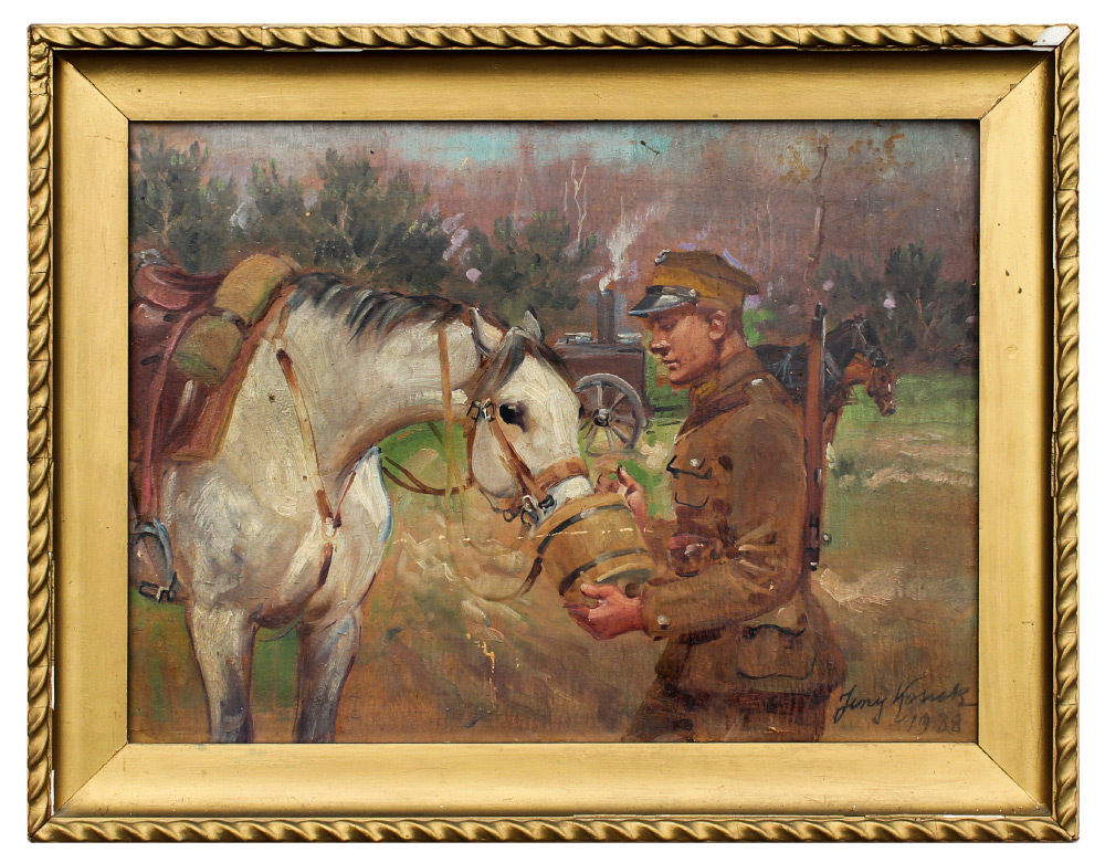 KOSSAK, Jerzy, (Polish, 1886-1955): Soldier Feeding Horse a Bucket of Oats, Oil/Board, 12'' x 16'', signed lower right, dated 1938, framed 15'' x 18.75''. As a third generation painter, the Kossak name was well sought after in the early 1900's. He specialized in realism, most specifically of military scenes.