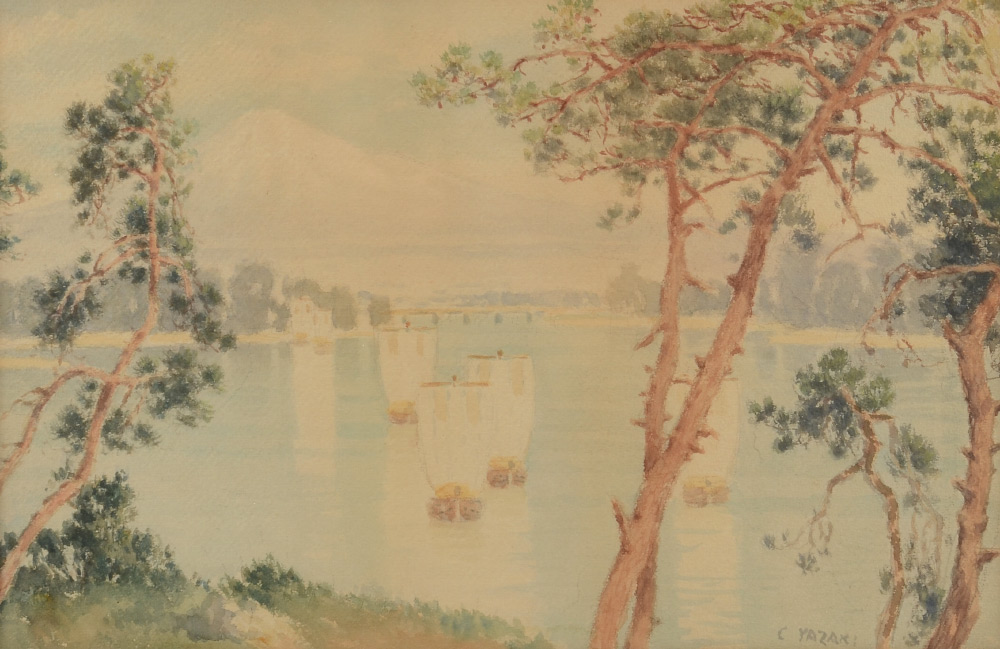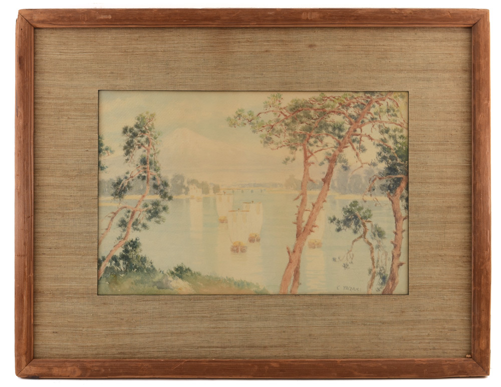 YAZAKI, C. (Indonesian, 19th, 20th C.): Japanese Harbor with Sampans and Mount Fuji in the Distance, Watercolor, sight size 12.25'' x 18.75'', signed lower right, framed 22.5'' x 29''.