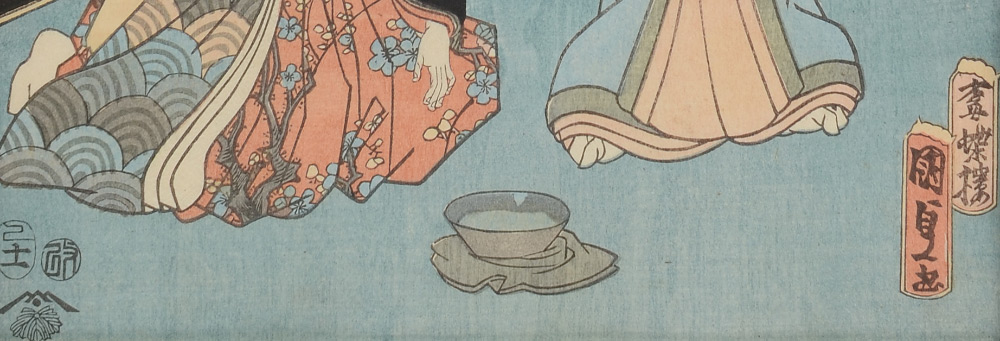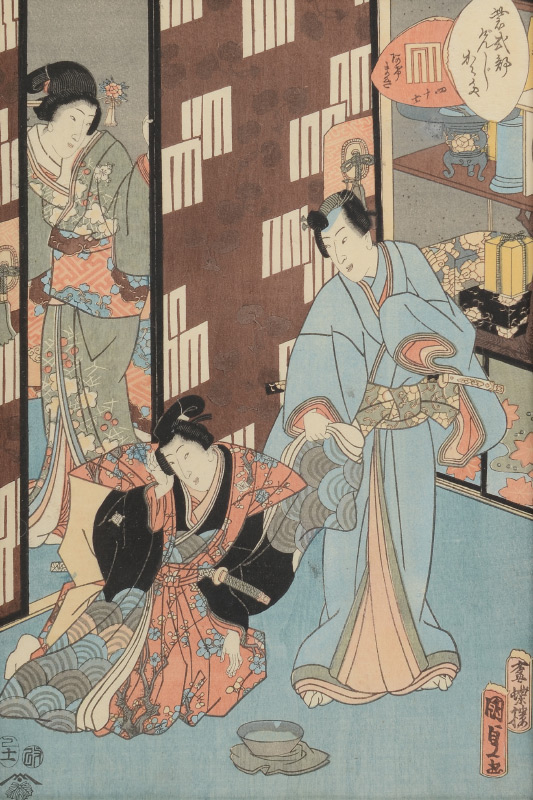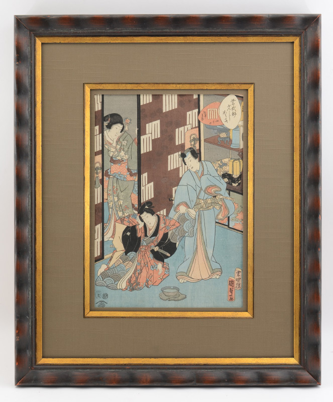 JAPANESE UKIYOE WOODBLOCK WITH GEISHAS: Sight size 12.5'' x 8.5'', custom contemporary frame, 21.5'' x 17.75''.