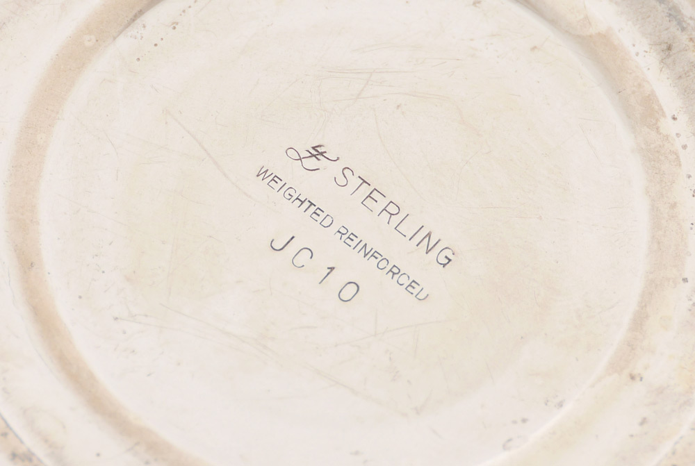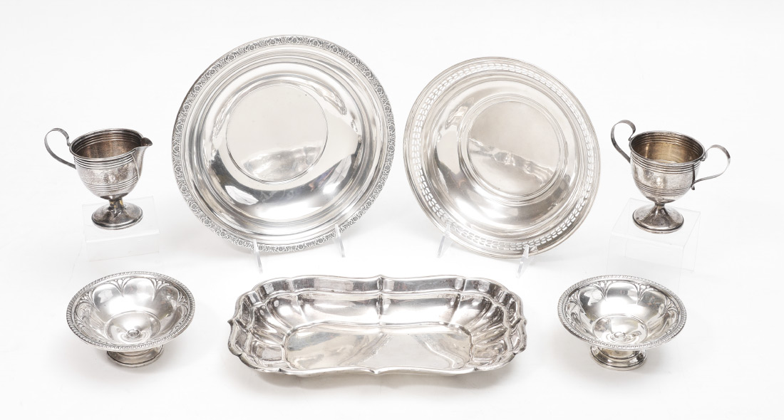7 PIECE ESTATE COLLECTION OF STERLING: An assembled collection of 7 pieces total to include 1) International Sterling bowl in the Prelude pattern with embossed floral rim, 1 3/4'' h. x 10''. 2) Reed & Barton bowl with reticulated rim, 2'' h. x 9''. 3) Reed & Barton rectangular tray in the Windsor pattern, 11 3/4'' x 6 1/2''. 4-5) Unknown maker embossed footed weighted dishes, 2'' x 5''. 6-7) La Pierre weighted creamer & sugar, 4 1/4'' h. Approx. 31.3 troy oz.
