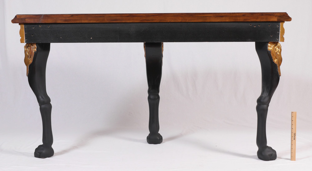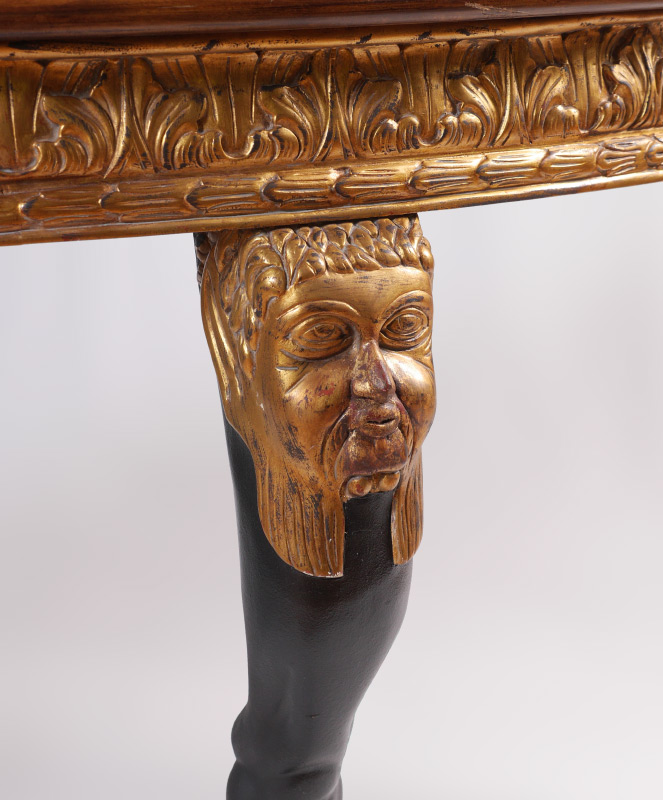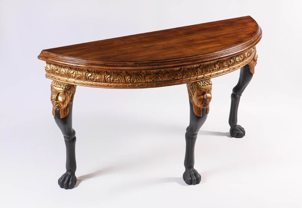 CARVED GILT WOOD DEMI LUNE CONSOLE TABLE: Demi lune shaped top, carved gilt wood foliate motif skirt. Ebonized shaped legs with carved gilt wood masquerons at joints, hoof feet. Overall measures 36'' h. x 65 1/2'' x 22''.