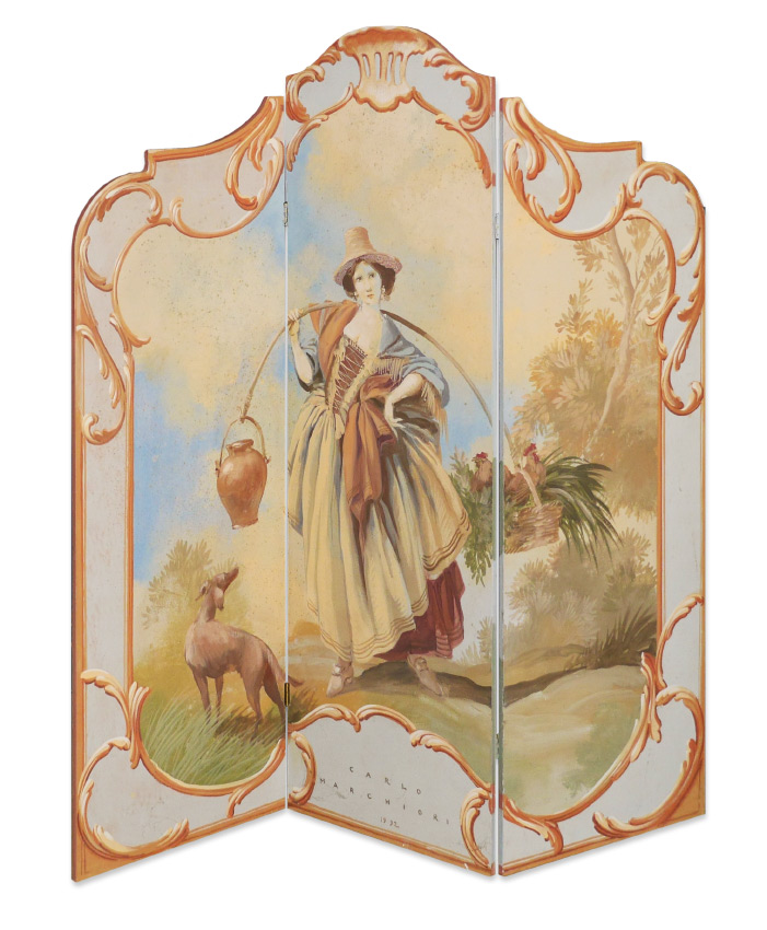 MARCHIORI, Carlo, (Italian, 20th Century ): Hand painted shaped tri-fold screen or wall hanging, decorated with provincial maiden holding a jug of water and basket of chickens on a pole, dog running along side. Signed Carlo Marchiori and dated 1992, center panel 51 1/2'' h. x 16''. Italian born, Carlo Marchiori studied classic art and academic design in Padua and Venice. At the age of eighteen, he left Italy to live in Canada where he worked as illustrator and film animator for C.B.C. Television and the National Film Board of Canada. In 1967 he was nominated for an Academy Award for an animated short but eventually abandoned filmmaking and advertising for mural paintings.