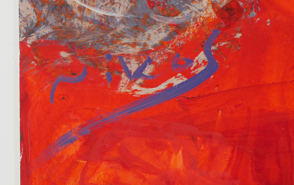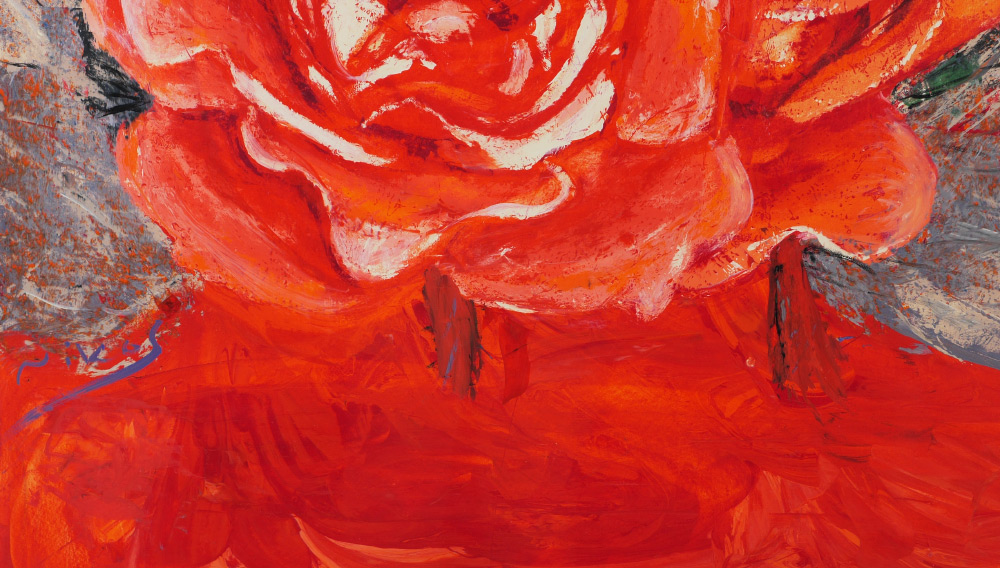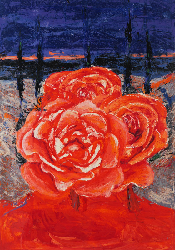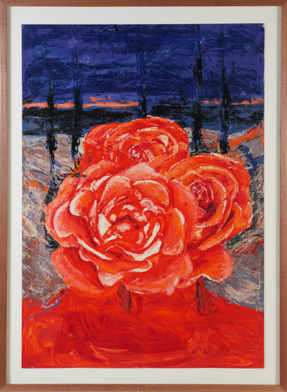 KYPRAIOS, Nikos, (Greek, 1944-): ''Rose II'', Oil/Paper, 37'' x 27'', signed lower left, framed 44'' x 32.5''. Through his travels, Kypraios has combined two cultures vividly in his work. After studying art in Athens, Greece, he moved to Australia in 1972 where he fell in love with the strength and vitality of Australian landscapes and combined well known mythology and ambience of Greece as a Nation. As a master painter, Kypraios has been shown in several exhibits around the world, including Singapore, various places in Asia, Australia as well as the National Gallery of Athens and the National Gallery of Australia.