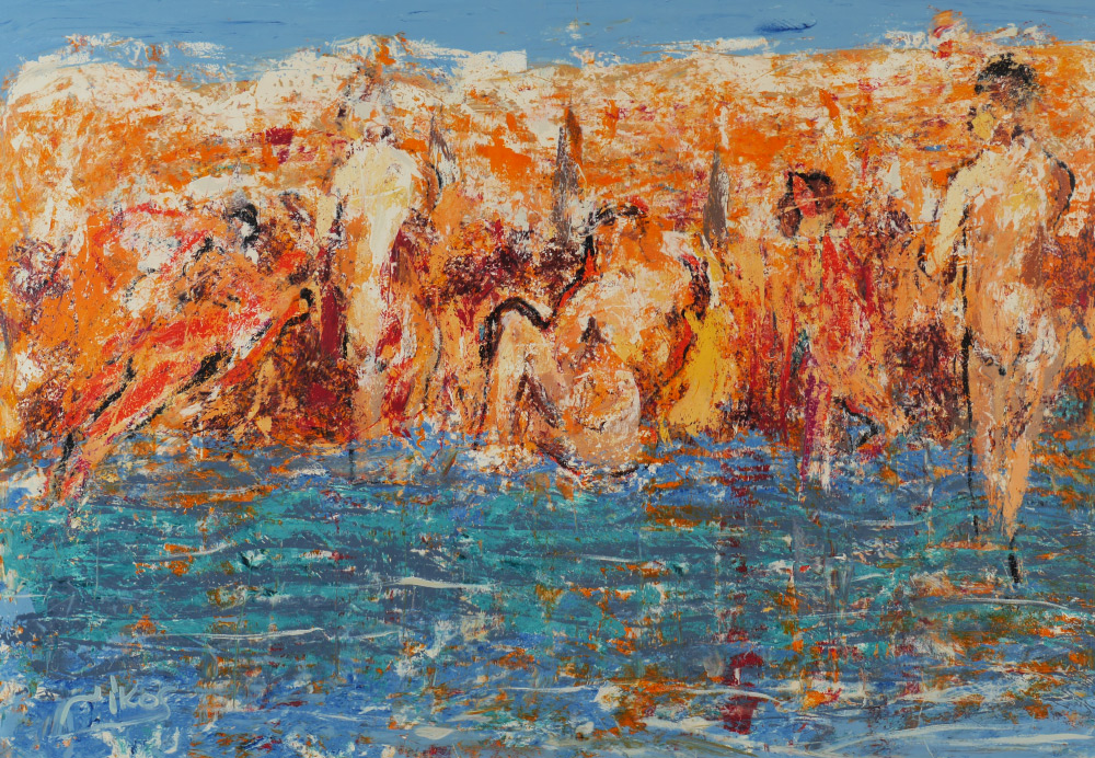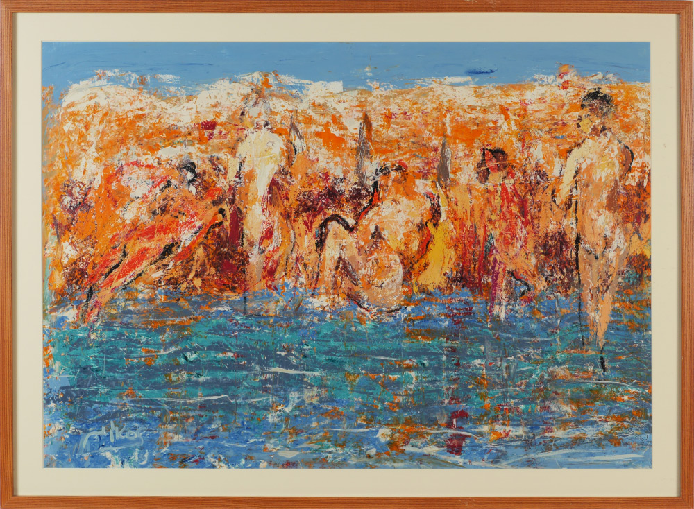 KYPRAIOS, Nikos, (Greek, 1944-): ''Nude II'', Oil/Paper, 32'' x 43'', signed lower left, framed 41.5'' x 43''. Through his travels, Kypraios has combined two cultures vividly in his work. After studying art in Athens, Greece, he moved to Australia in 1972 where he fell in love with the strength and vitality of Australian landscapes and combined well known mythology and ambience of Greece as a Nation. As a master painter, Kypraios has been shown in several exhibits around the world, including Singapore, various places in Asia, Australia as well as the National Gallery of Athens and the National Gallery of Australia.