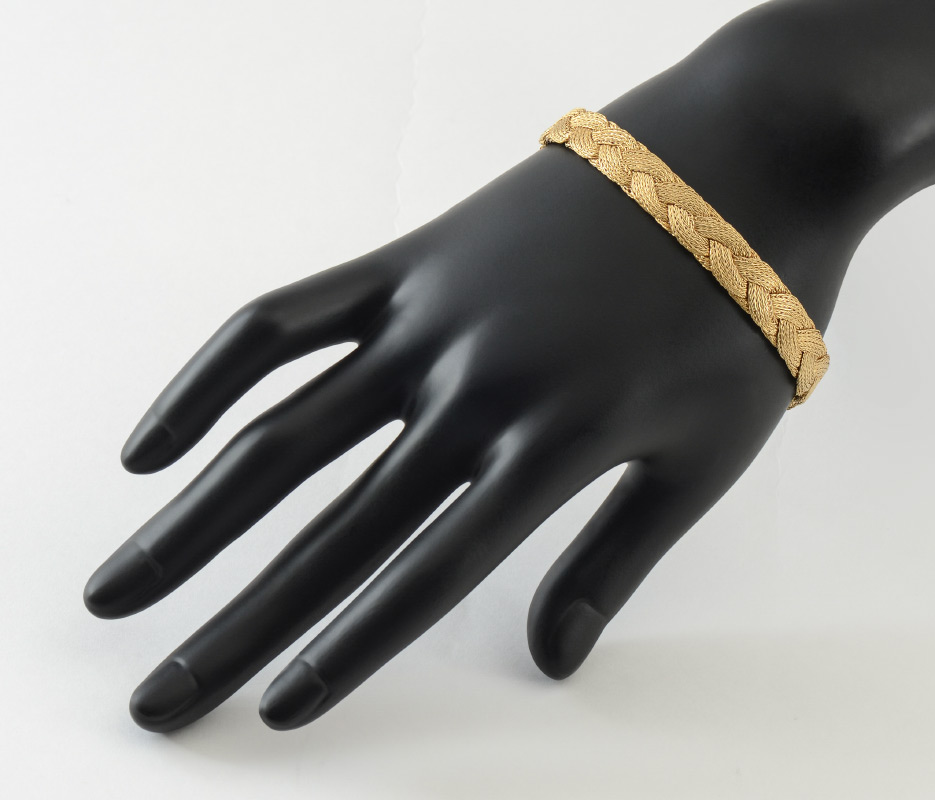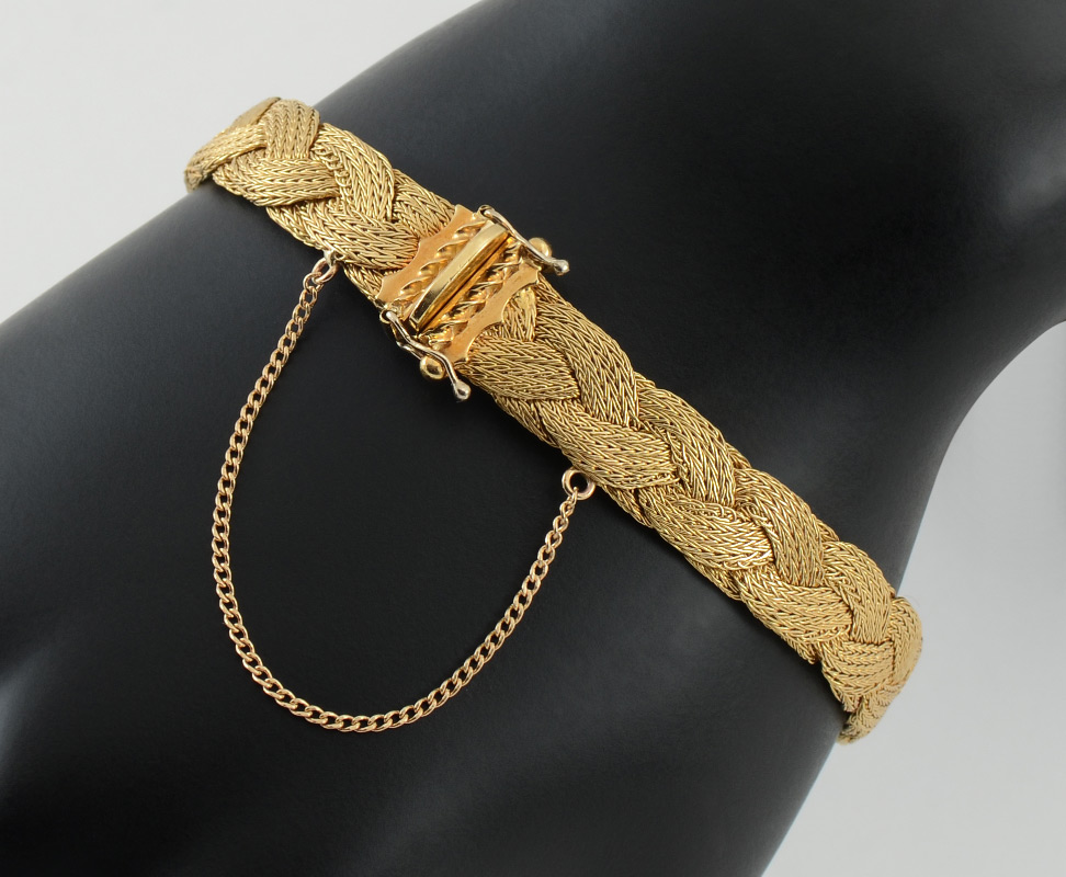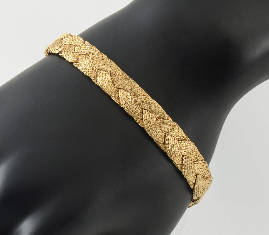 18K FLEXIBLE BRAIDED BRACELET: 18K yellow gold flexible braided bracelet. Measures approx. 8'' length by 3/8'' wide. Hidden box pressure clasp with two figure eight safety clasps and a safety chain. Weight 33 grams. Sold with current Atlanta Gemological GIA graduate's appraisal for $3,500.