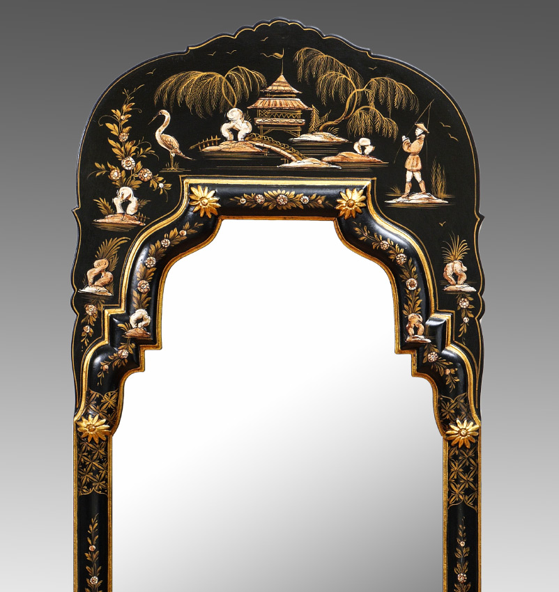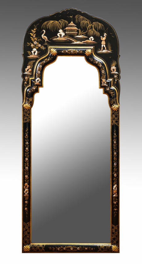 CHINOISERIE DECORATED MIRROR: Made in Italy. Shaped looking glass with raised Chinoiserie decoration. Almost 5 ft tall measures 58'' x 24''.