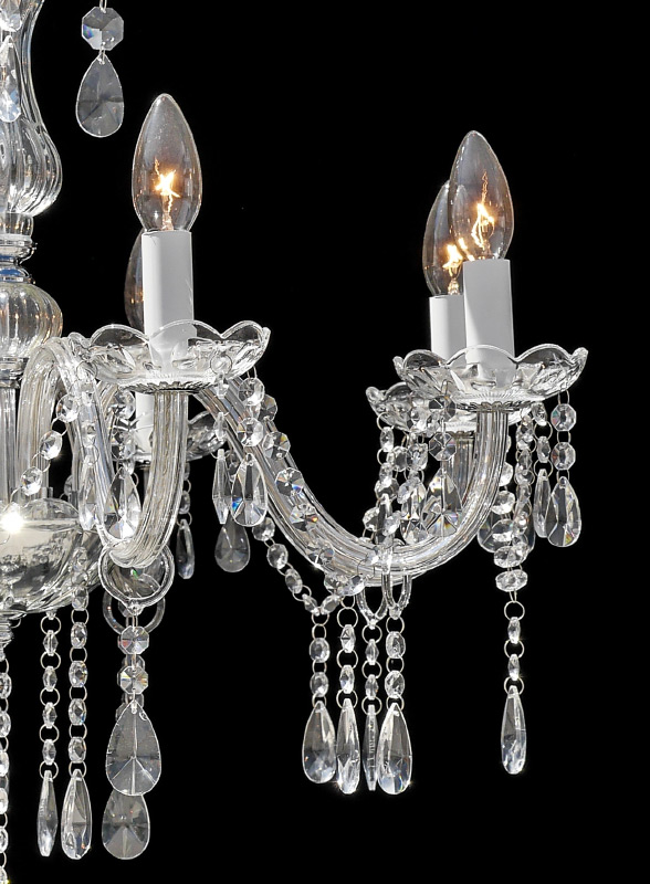 8 LIGHT CRYSTAL CHANDELIER: Contemporary 8 light chandelier with chrome frame, clear glass body, arms, garland, prisms, and drops. Approx. 25'' h. x 26''.
