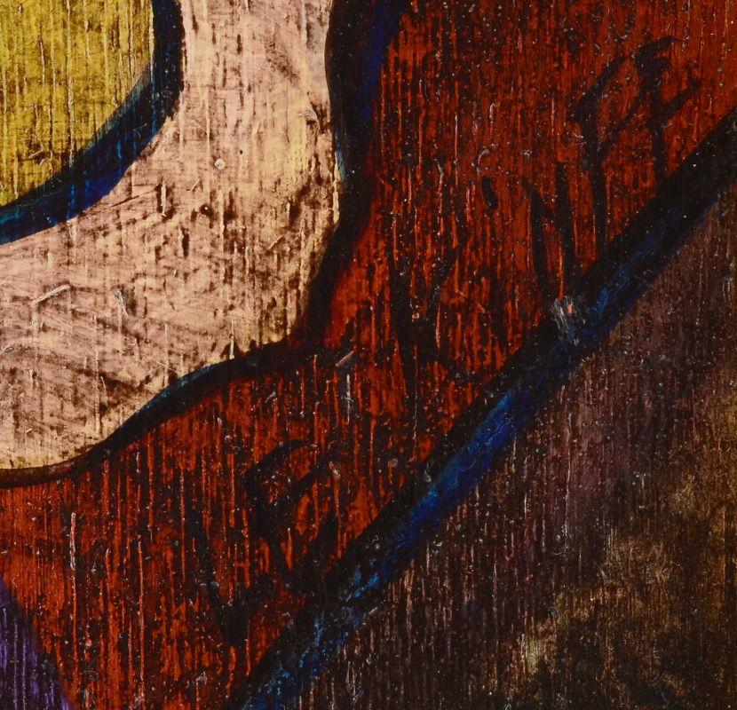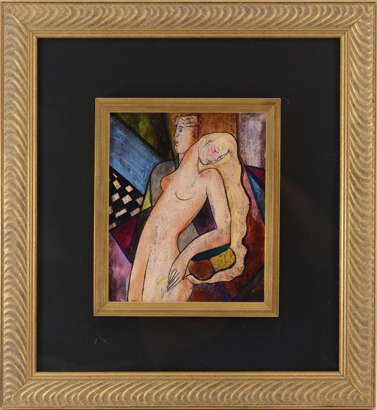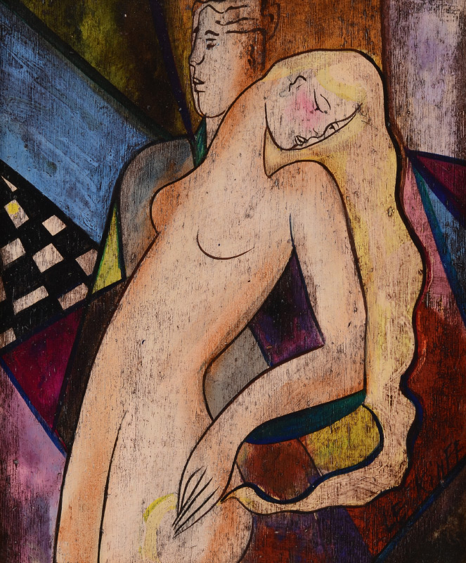 LE KINFF, Linda, (French, 1949-): ''Tempete'', Acrylic/Wood, Young Female Nude and Male Lover, 10.5'' x 8.25'', signed lower right, custom frame, 22'' x 20.5''. Educated in Italy, Le Kinff studied after the Old Masters and became quite versatile in her work. Her versatility expands to graphic arts, tempera, use of gold leaf, painting, etching and sculpting. With a whimsical view on reality and beauty, she has made herself among fellow contemporary artists around the world.