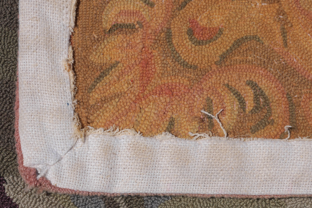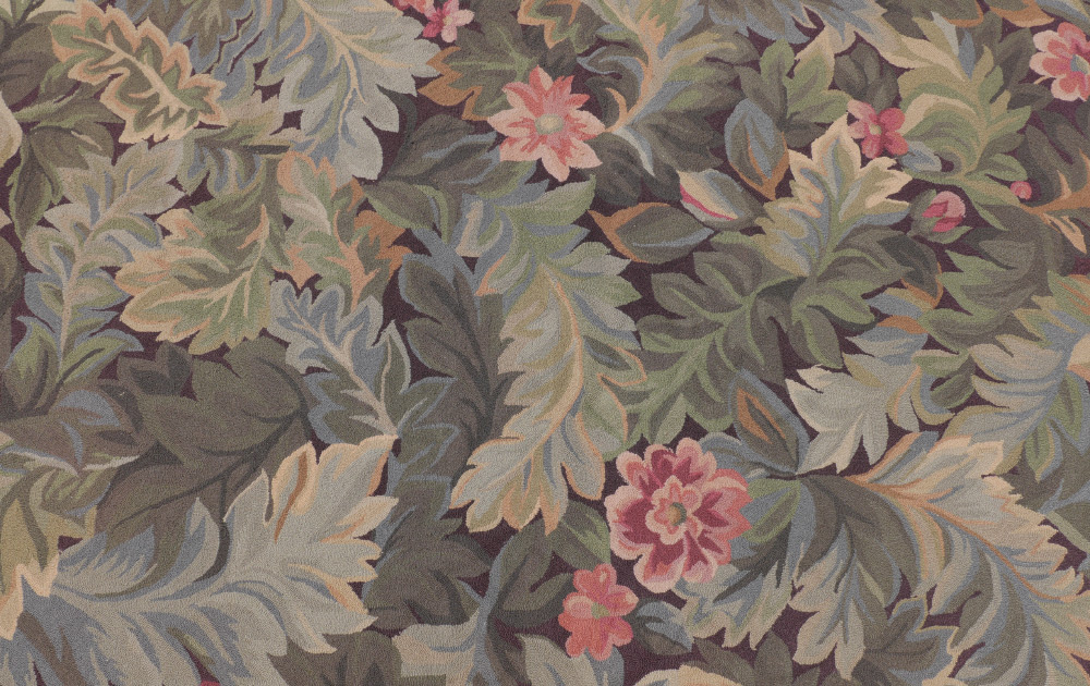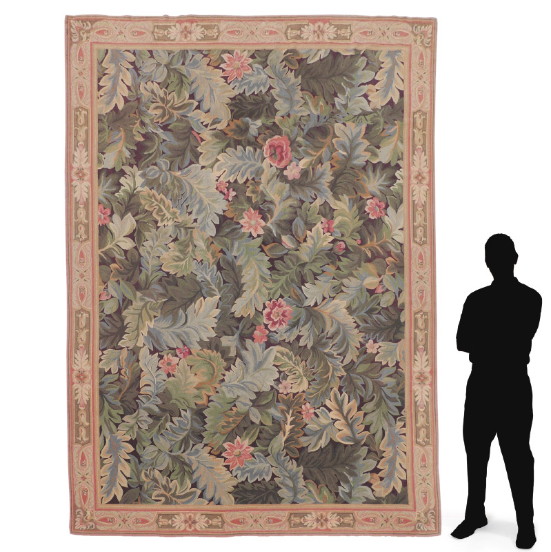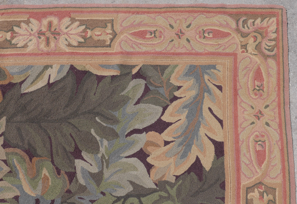 APPROX. 20-35 YR OLD CHINESE HAND HOOKED WOOL RUG, 8'4'' x 11'4'': This rug has a very tropical, Florida look with its overall pattern of large leaves of various types tumbling over each other, covering the whole field. Here and there a pink flower peeks through. The leaves are in colors of soft greens, blues, and a hint of pale yellow and beige. The narrow border is mostly pinks, ivory, and beige with a little green. The back of the rug has been latexed to hold the hooked pattern in place and this is the usual finish for this type of rug. Condition is good.