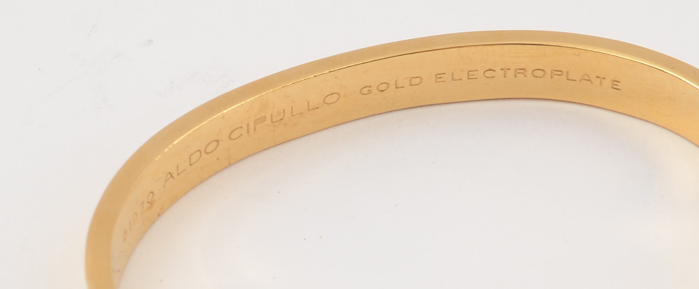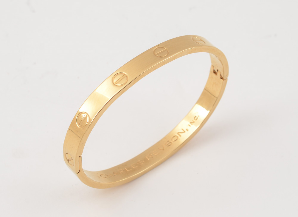 ALDO CIPULLO FOR CHARLES REVSON CARTIER LOVE BRACELET: 18K electroplate gold version of the classic Cartier ''Love'' bracelet, designed by Aldo Cipullo for Charles Revson Inc.. Well marked, sold with the original screwdriver to open the bracelet, blue felt bag and paperwork. Bracelet 2 1/4'' x 1 3/4'' interior dia.