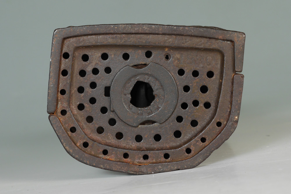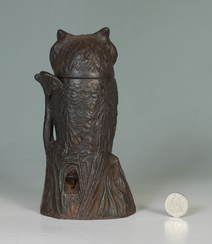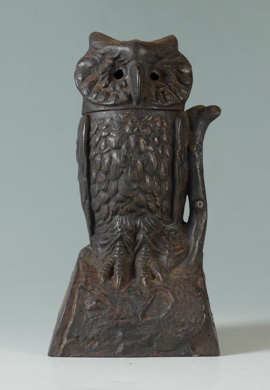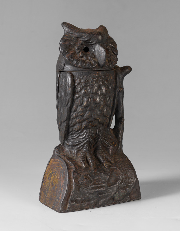 CAST IRON MECHANICAL OWL BANK: Owl on log, when button pressed the owls head turns to the left. Marked on base 1880, overall measures 7 1/2'' h. x 3 3/4'' x 3 1/4''.