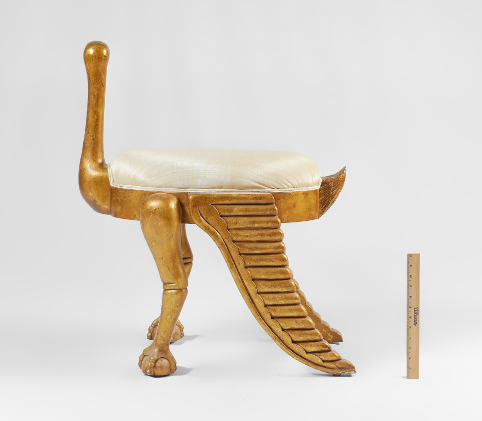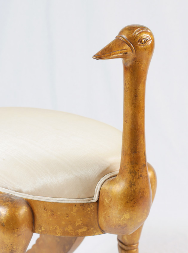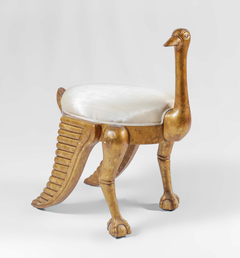 EGYPTIAN REVIVAL OSTRICH MOTIF STOOL: Carved gilt wood frame in the form of a stylized ostrich with wings down, on ball and claw feet. White upholstered cushion, overall measures 32 1/2'' h. x 28 1/2'' x 17 1/2''.
