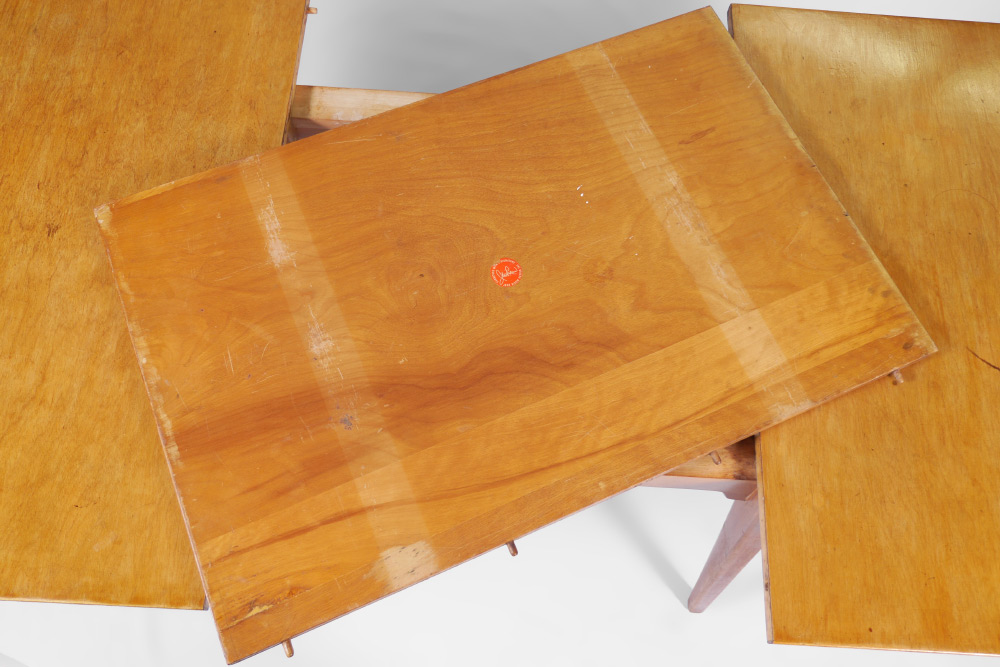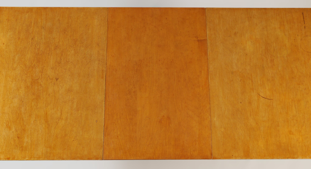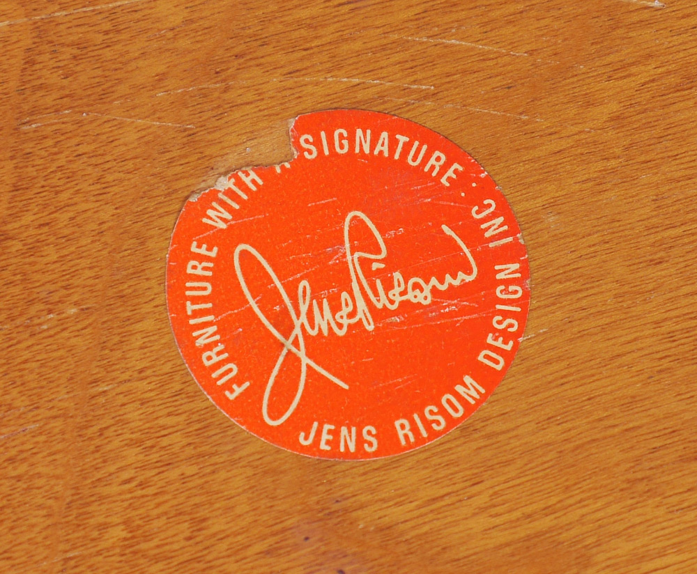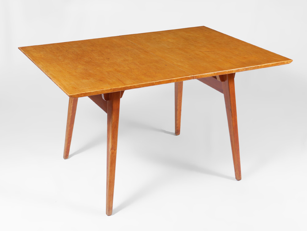 JENS RISOM DINING TABLE & LEAF: Rectangular top on 4 slightly splayed legs, single 22'' leaf. Well marked with paper labels, table measures 29 1/4'' x 50'' x 34''.