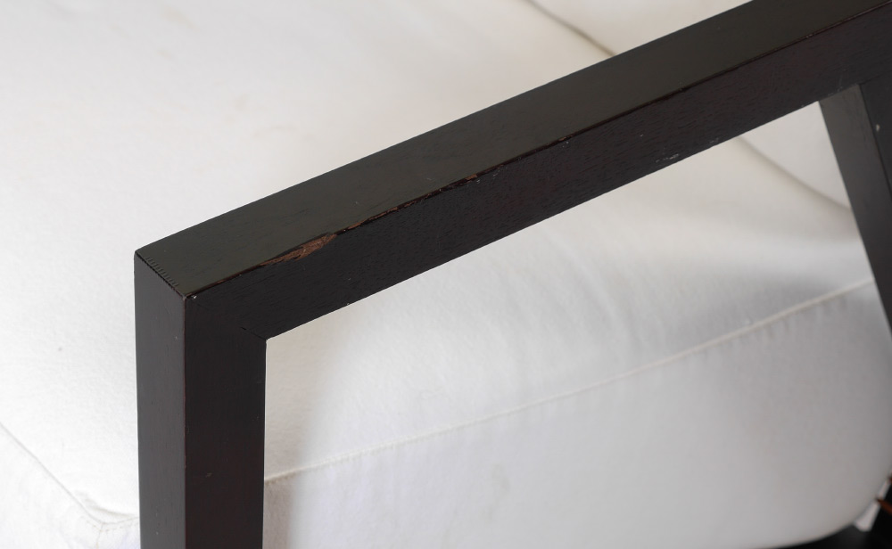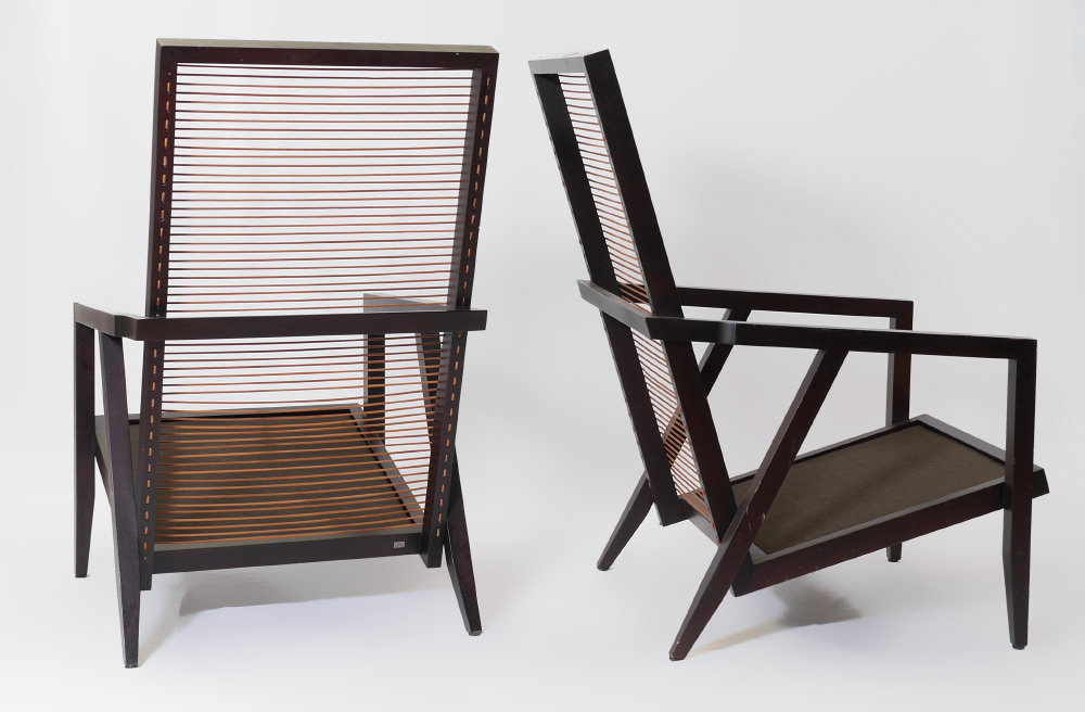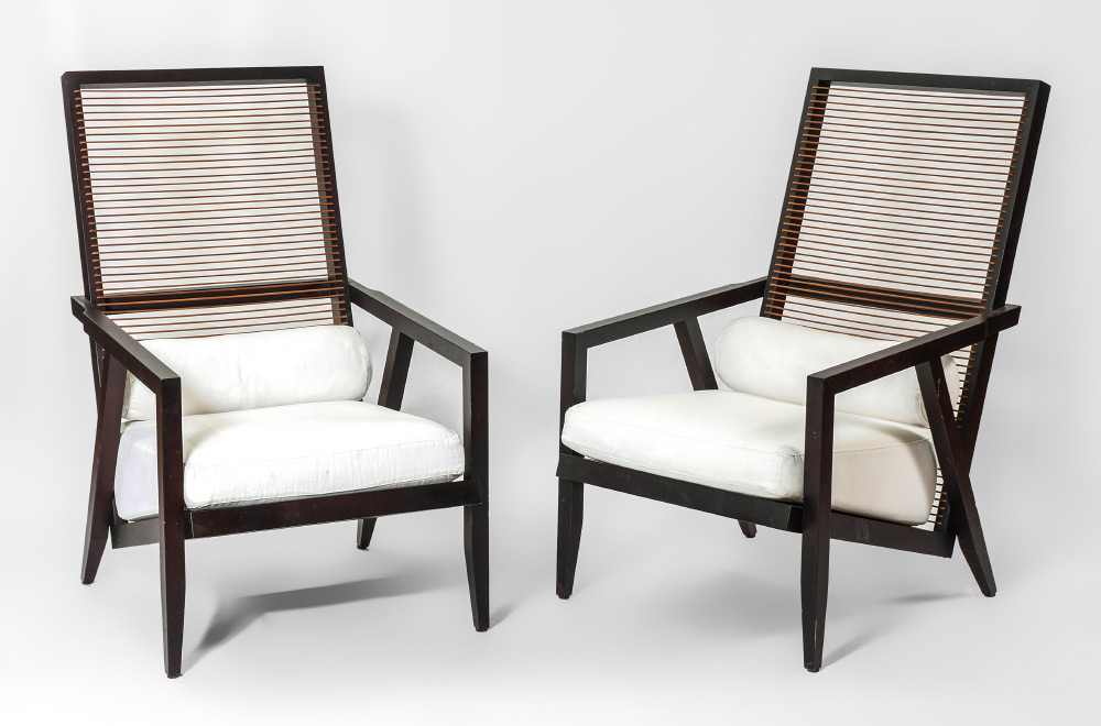 PAIR PIERANTONIO BONACINA ASTORIA LOUNGE CHAIRS: Two of the Astoria high back lounge chairs, leather cord back, stained wood with white canvas seat and bolster cushions, tagged on back. Overall measure 43 1/2'' h. x 26'' x 36''.