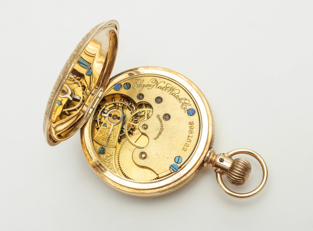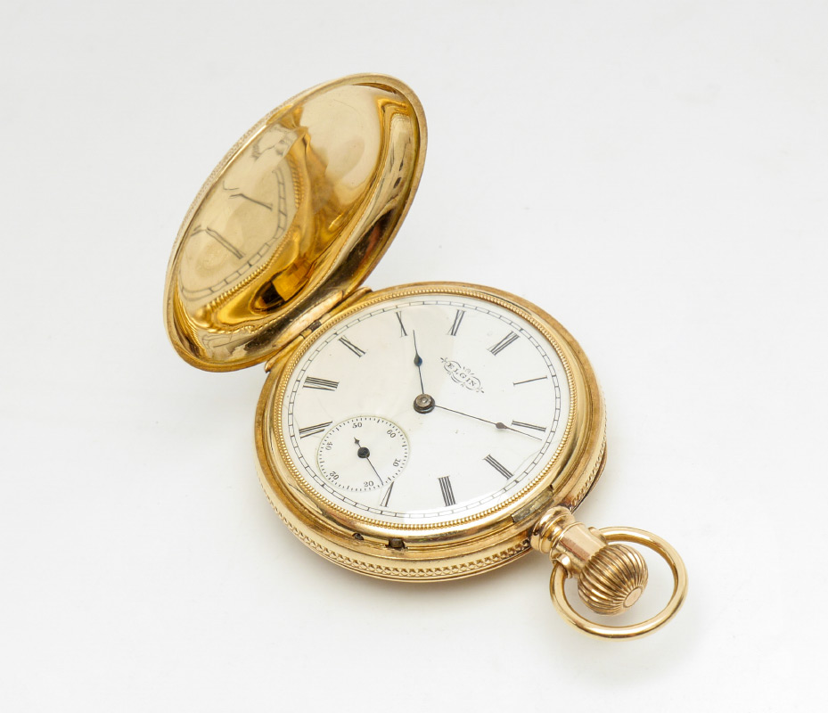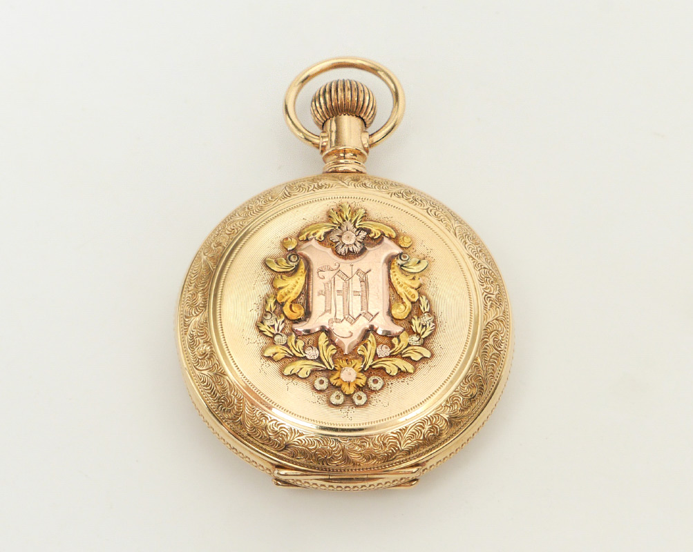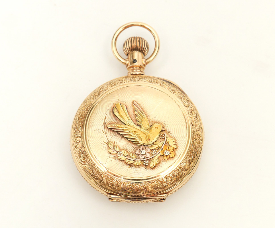 14K GOLD ELGIN POCKET WATCH: 14k gold hunter case with applied wreath with M in shield front covered, bird with branch motif on back, engraved name on dust cover, size 8s movement, serial number 3981622, dates to 1890, 11 jewels, enamel dial marked Elgin. Overall 1 5/8'' dia., approx. 59.9 grams.