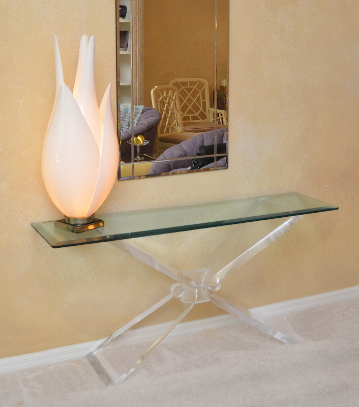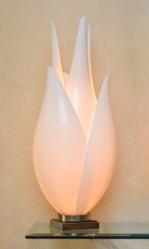 LARGE ROUGIER ACRYLIC TULIP TABLE LAMP: Tall white acrylic overlapping petals on brass base. Marked Rougier, overall measures 33 1/2'' h. x 13''.