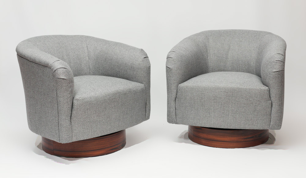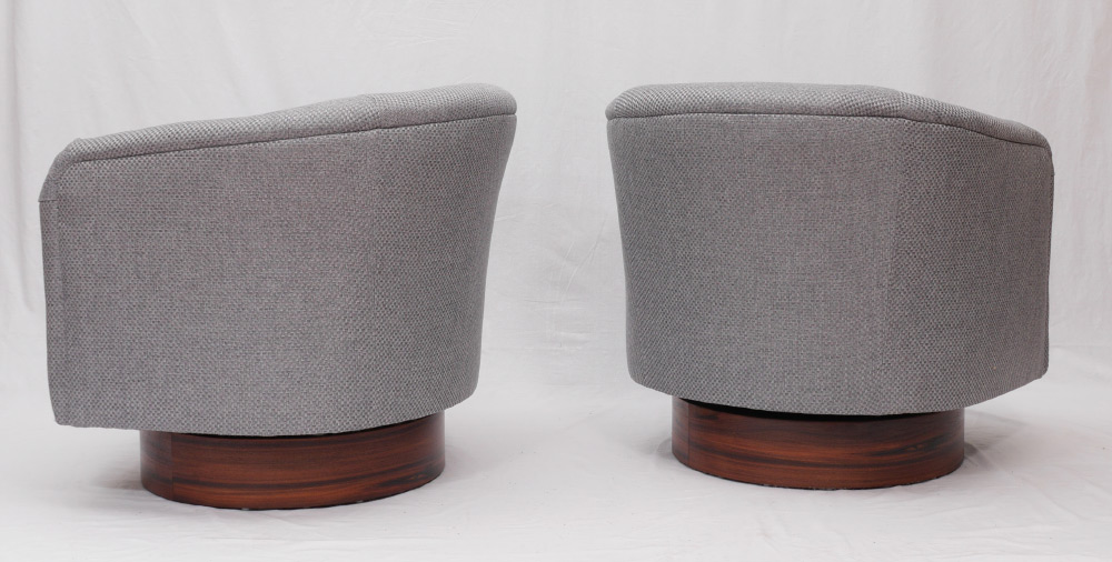 MILO BAUGHMAN FOR THAYER COGGIN, PAIR OF SWIVEL CHAIRS: Grey tweed upholstery with rosewood bases. Approx. 28''h. at back, 29.5''w. x 27''d., seat 19''d.