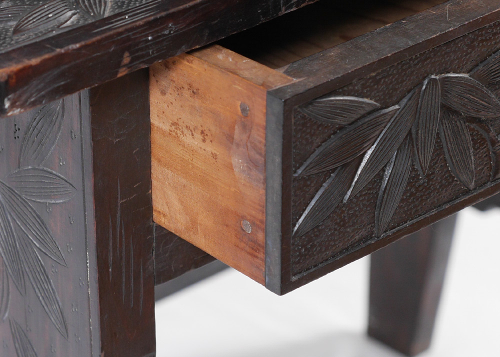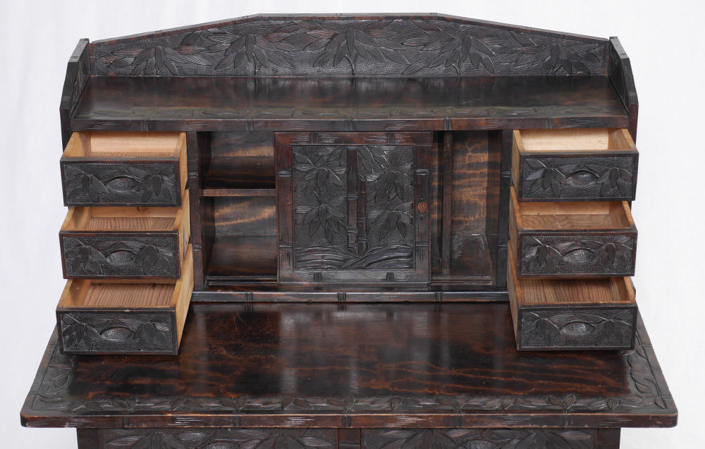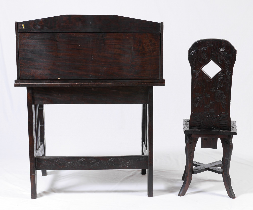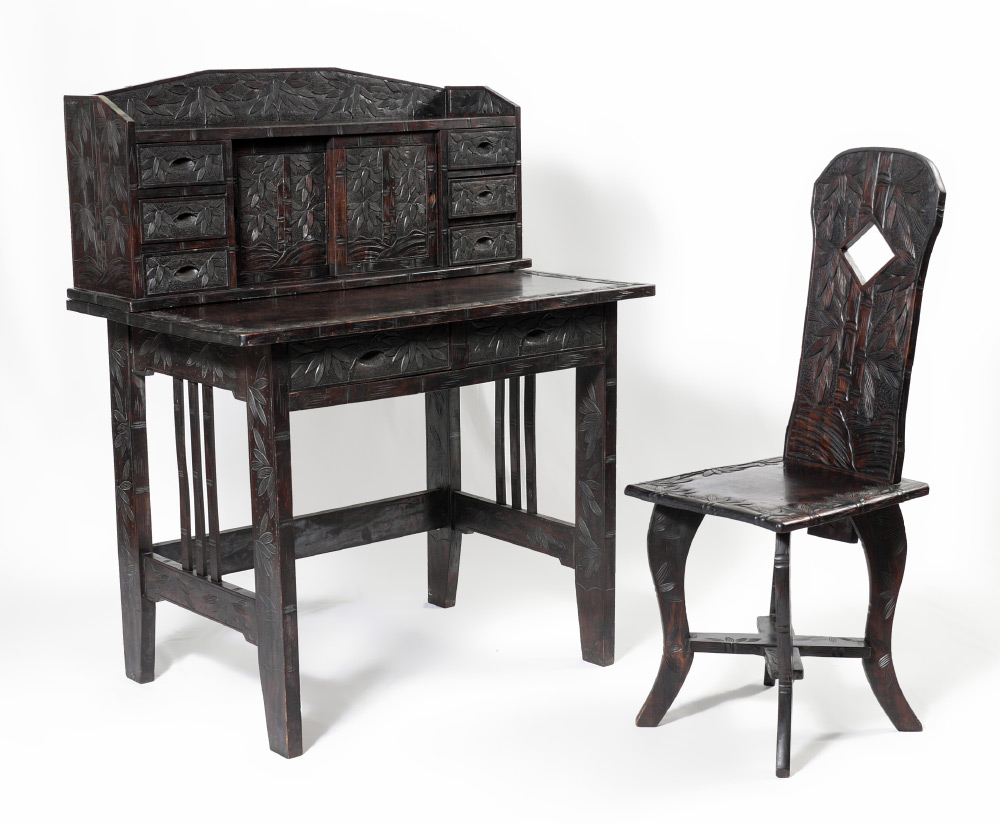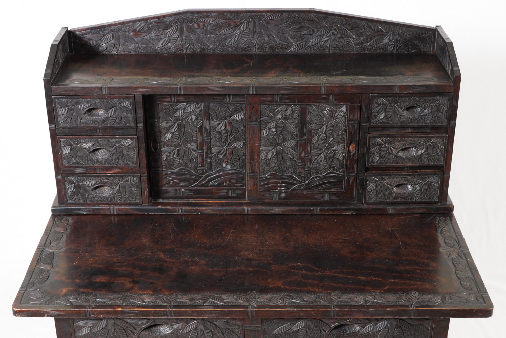 CARVED VIETNAMESE DESK AND CHAIR: Carved with bamboo motif all over, top with open gallery over 2 sliding doors with internal shelves, 3 drawers either side. Base with 2 drawers, overall 46 1/4'' h. x 24 1/4'' x 37''. Sold with the matching chair 41'' h. x 14 3/4'' x 17''.