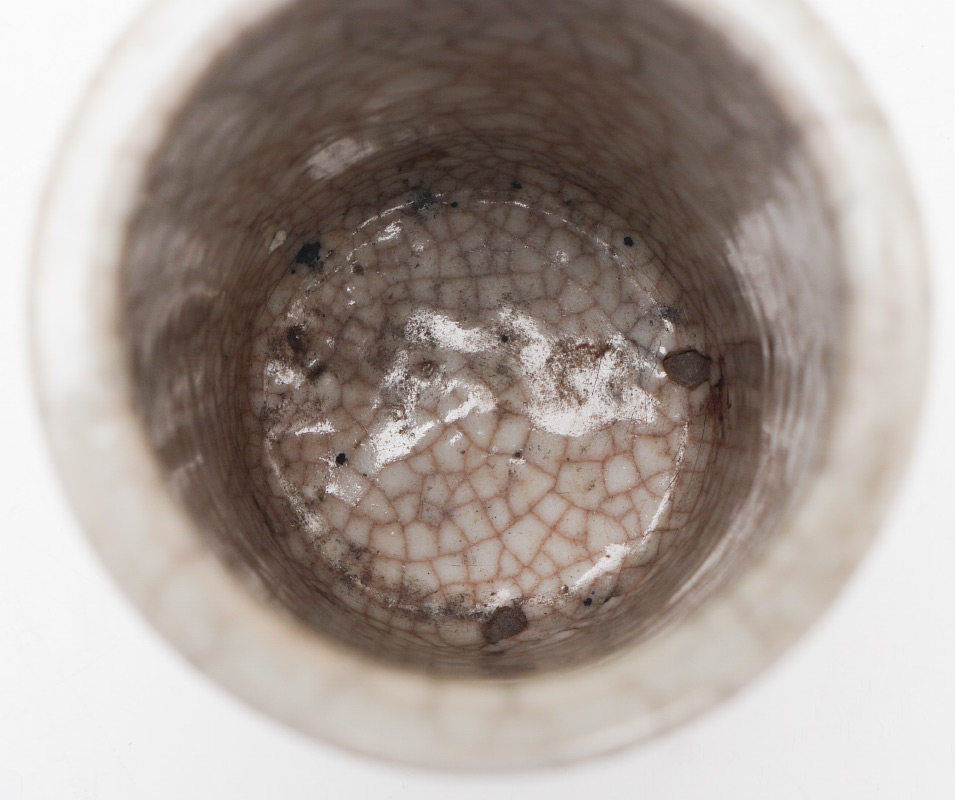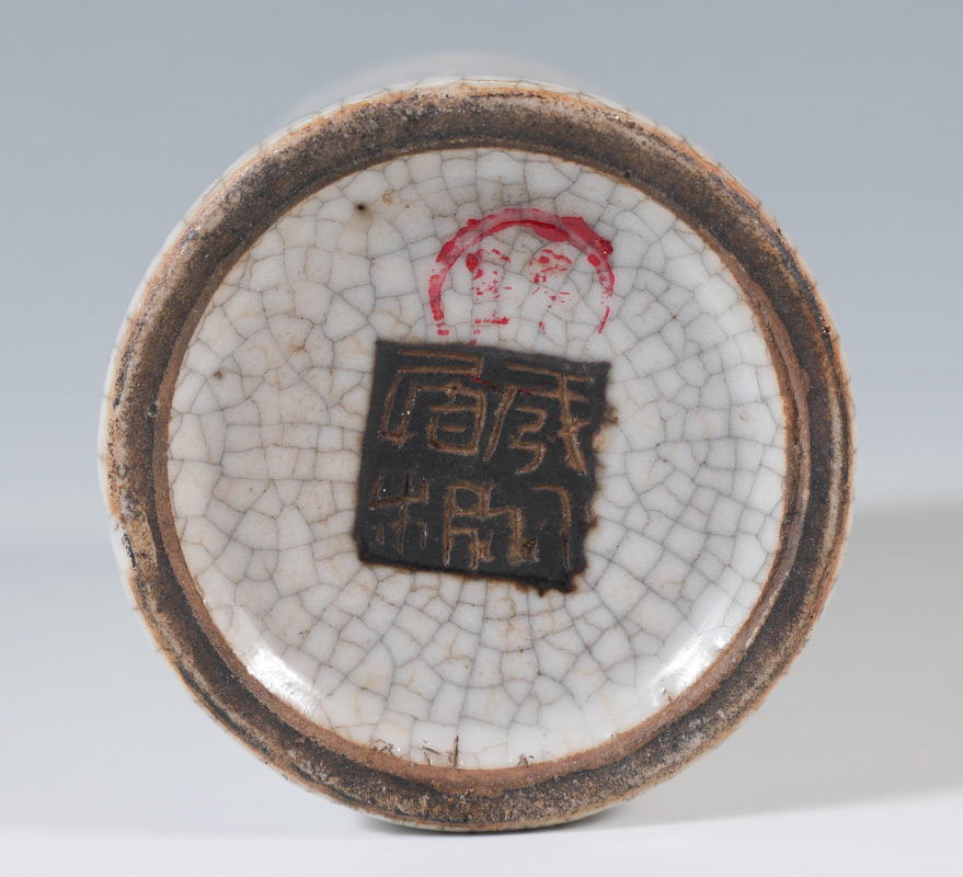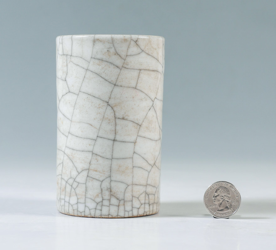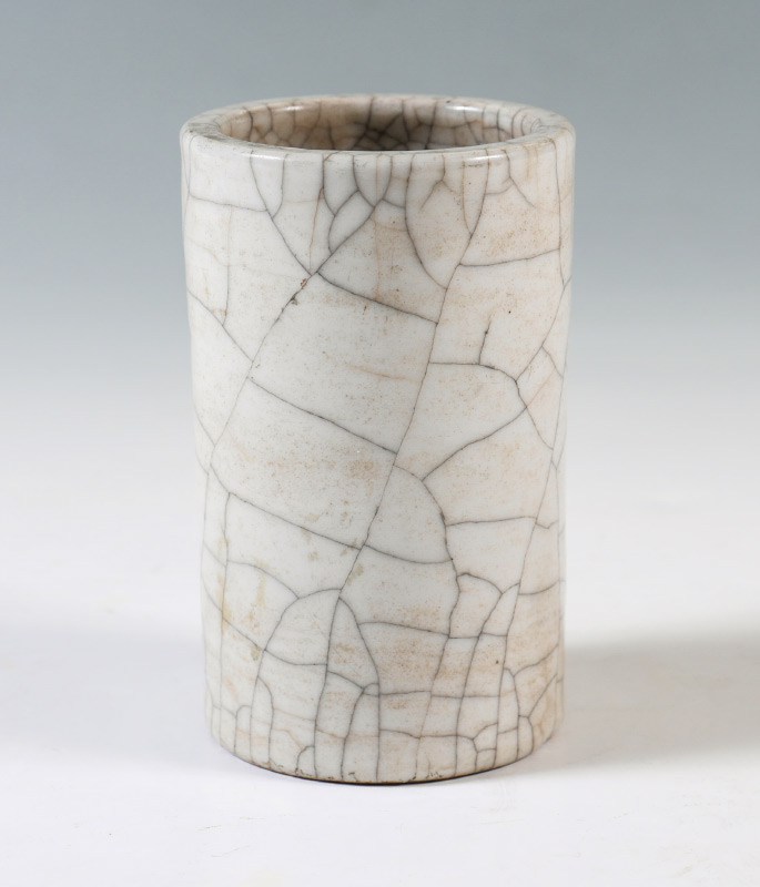 QING DYNASTY CRACKLE GLAZE BRUSH WASHER: Mid to late 19th century, cylinder form with crackle glaze, seal mark and red mark on base. 4 3/4'' h. x 3'' dia.