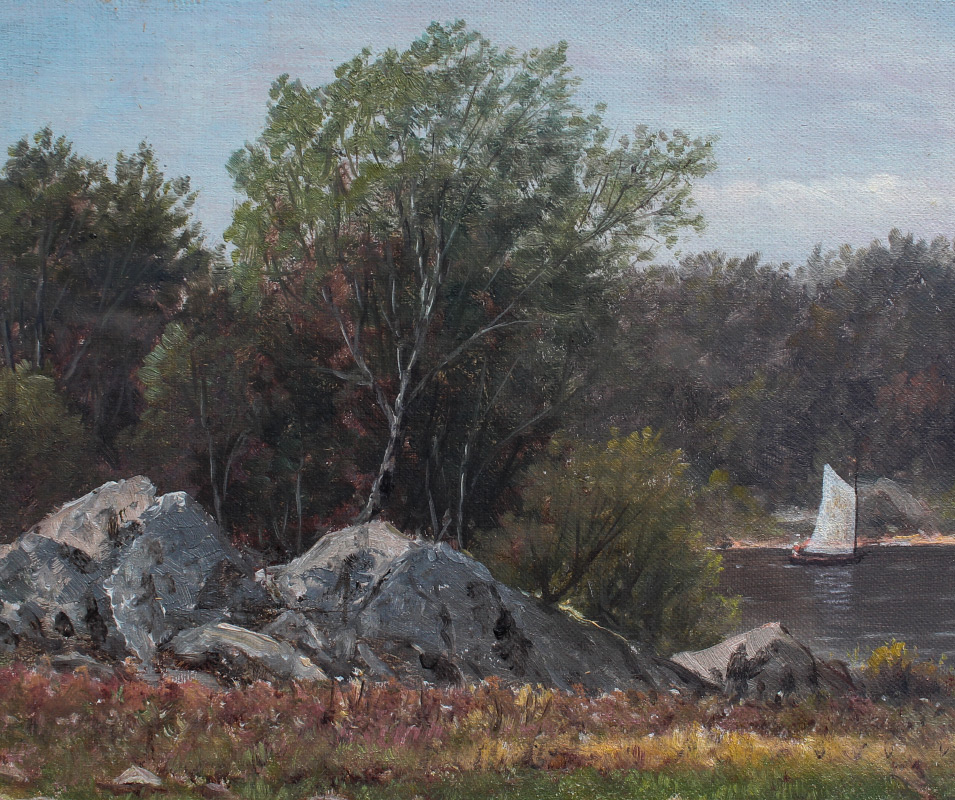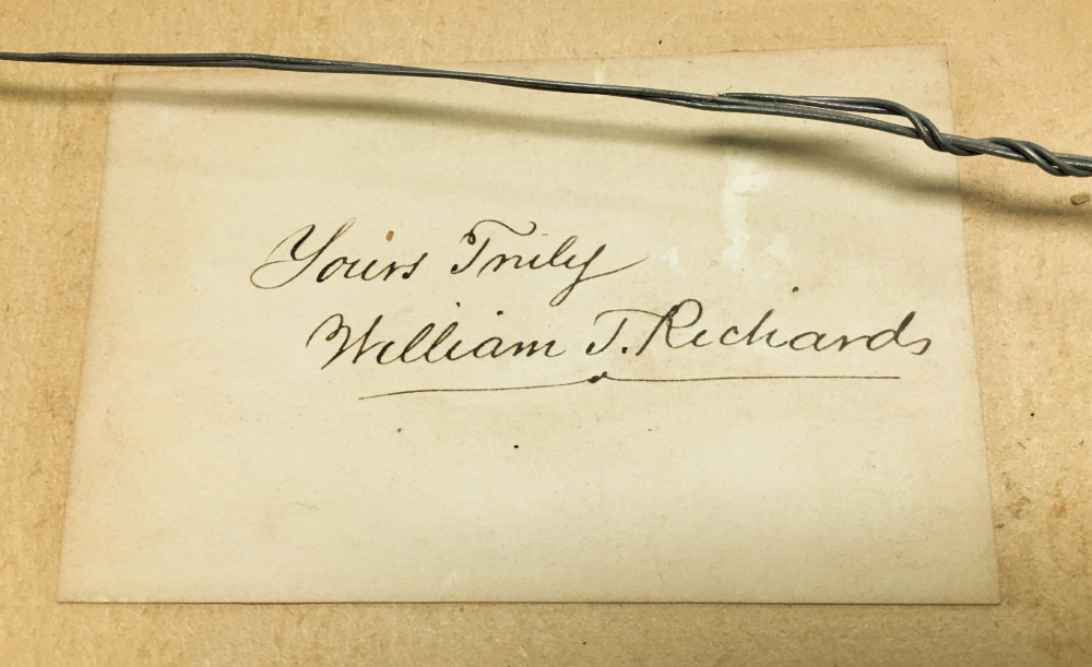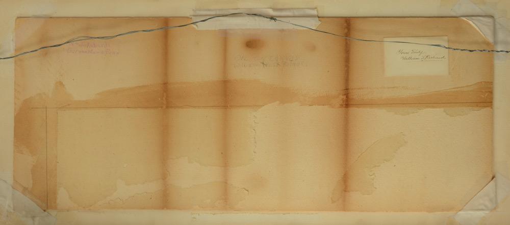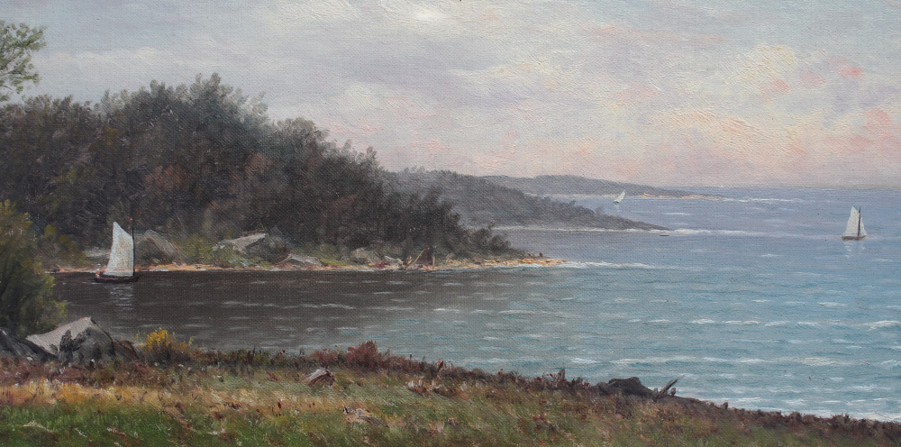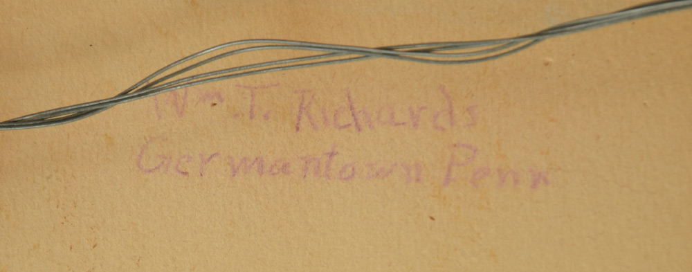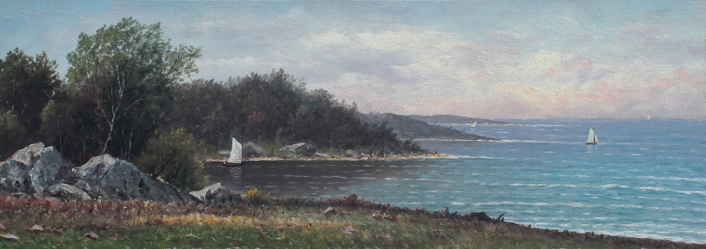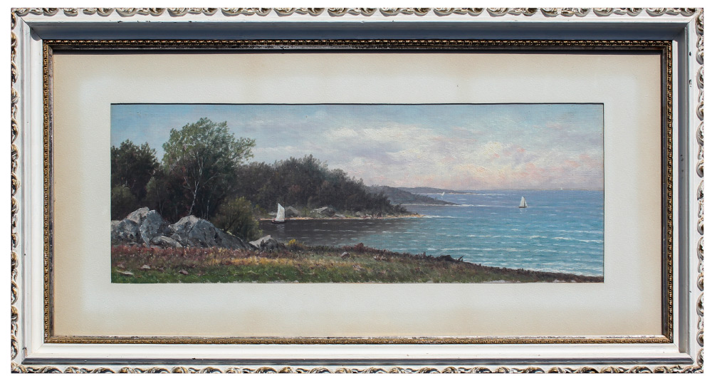 AMERICAN SCHOOL COASTAL PAINTING: Coastal Inlet Scene, Oil/Canvas Laid Down on Board, sight size 8.5'' x 23.5'', bears a business card size label verso that reads ''Best wishes Wm. T. Richards'', painted frame 17.25'' x 33''.