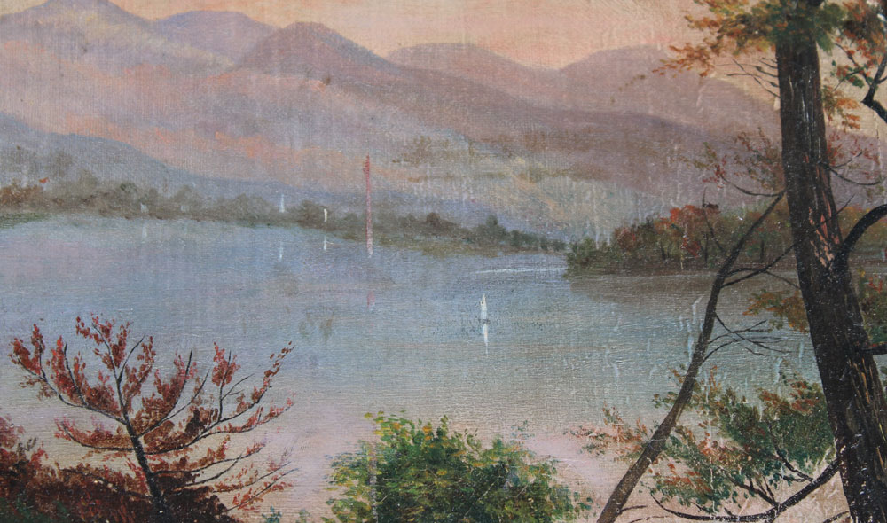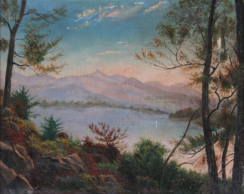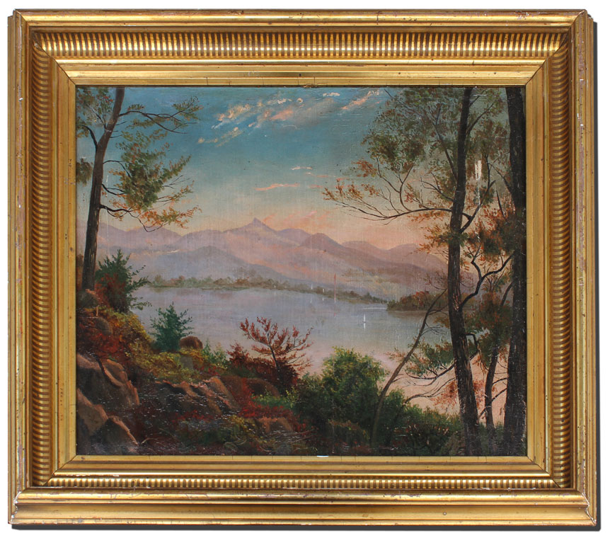 AMERICAN SCHOOL LAKESIDE SCENE WITH MOUNTAINS IN THE DISTANCE: Oil/Canvas Mounted on Board, 15'' x 17'', gilded frame with wear, 18'' x 21 1/2''.