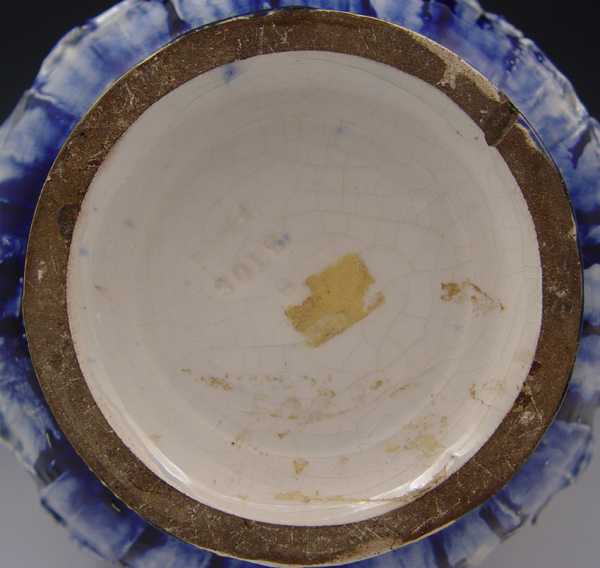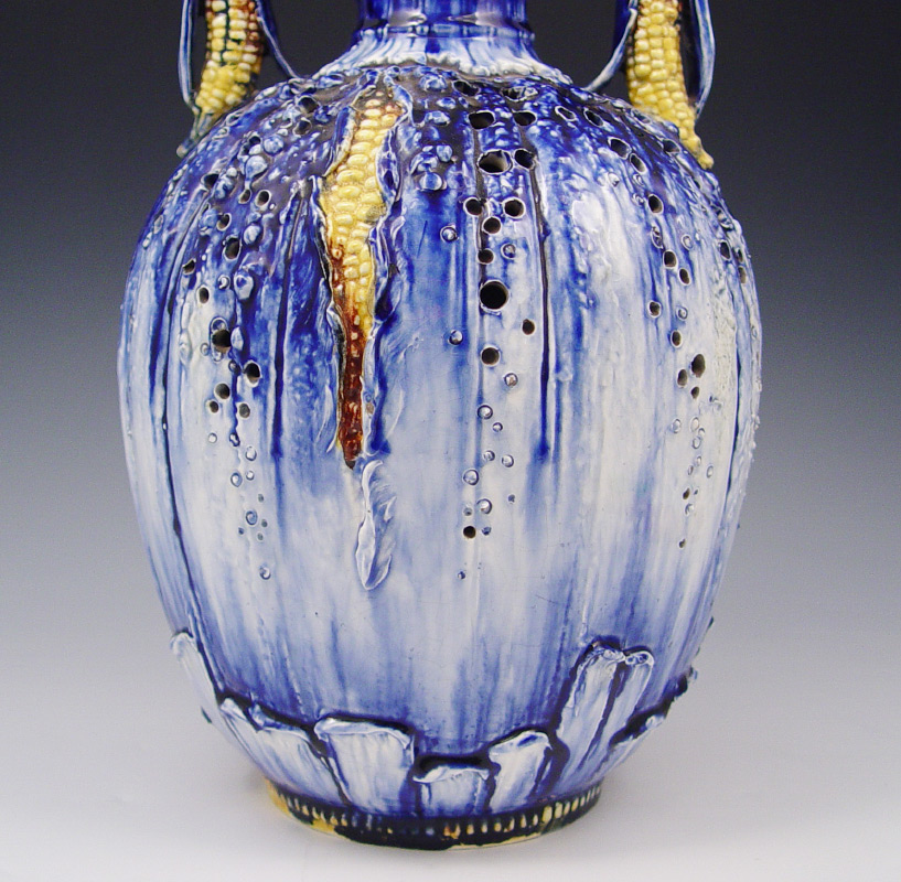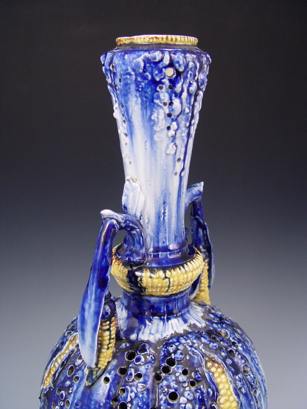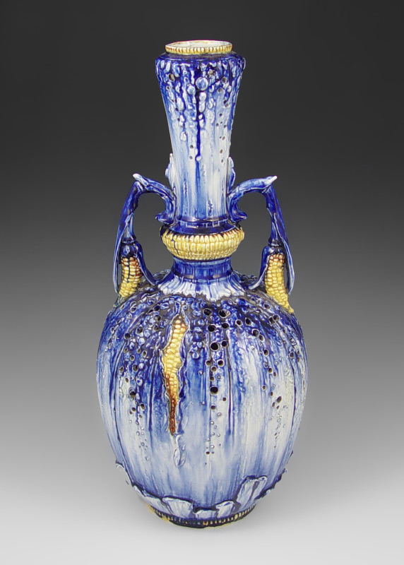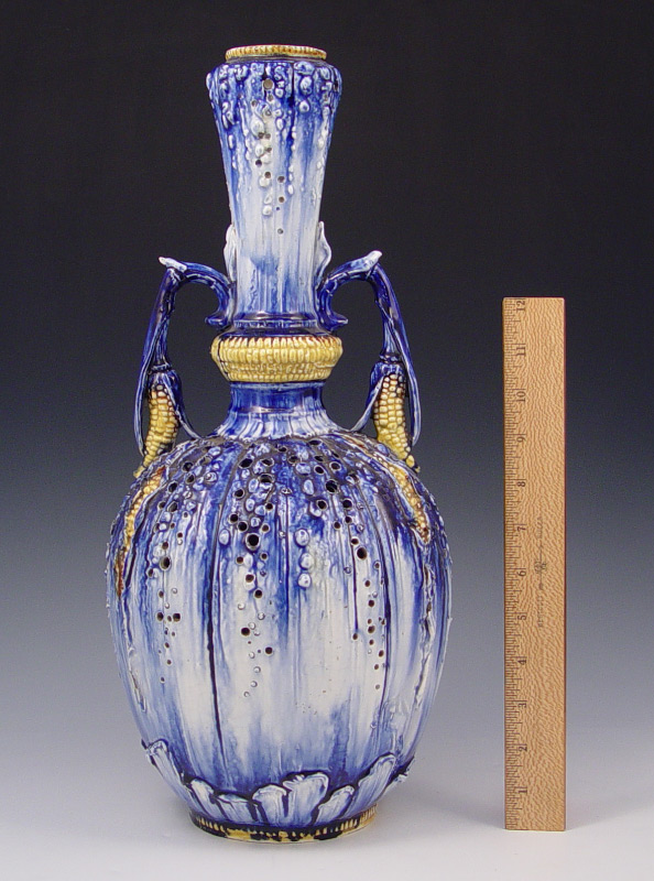 A MOST UNUSUAL COBALT MAJOLICA VASE WITH CORN: 18'' tall vase with pierced holes, corn peeking out at the handles, rim, neck and base. Impressed mark ''Regist. 9018''.