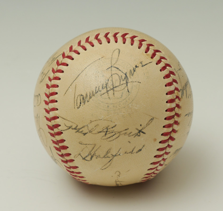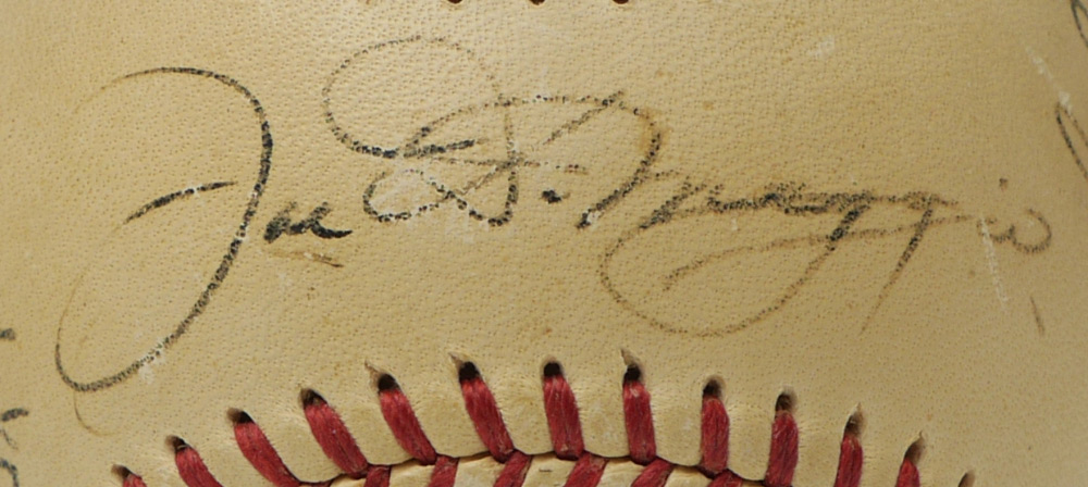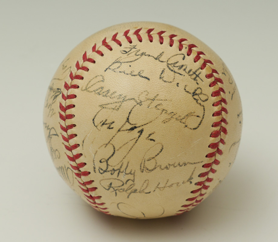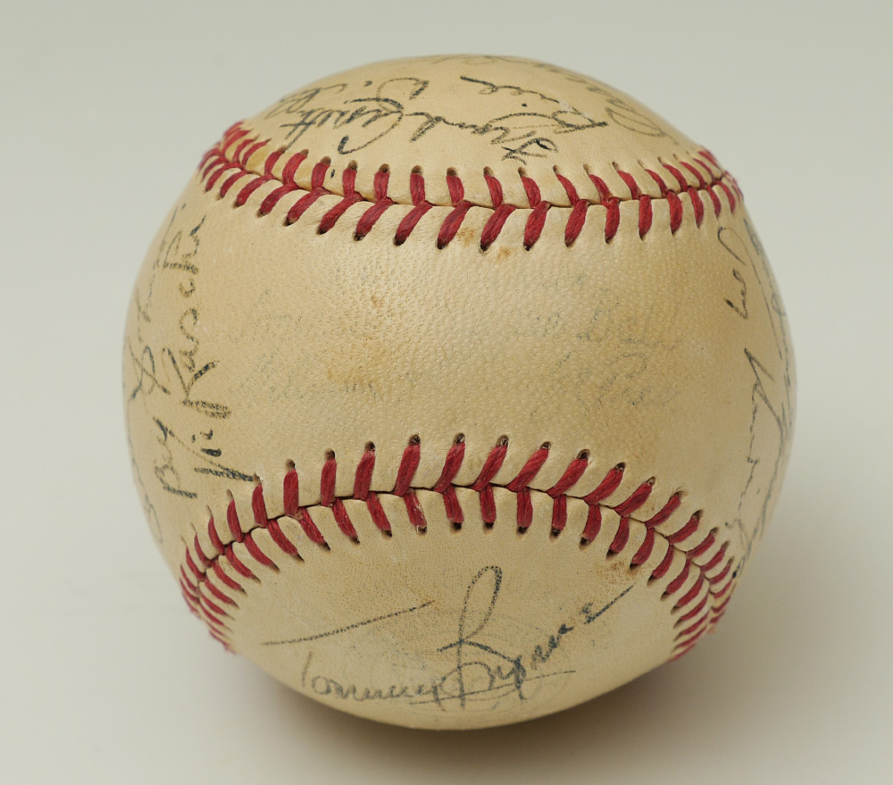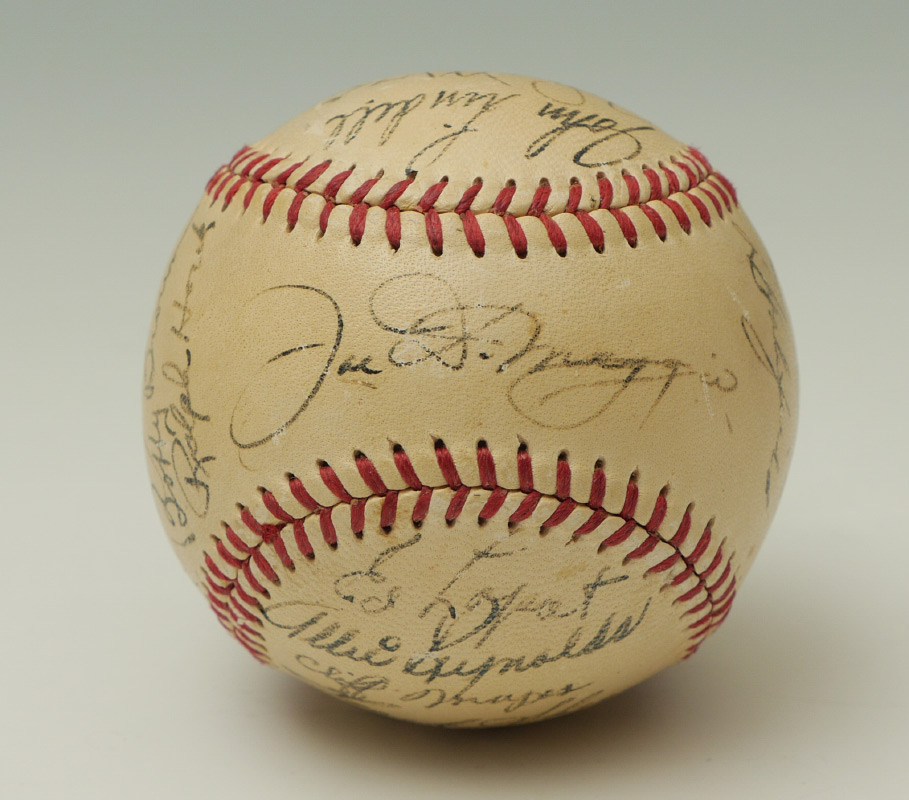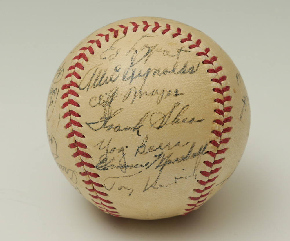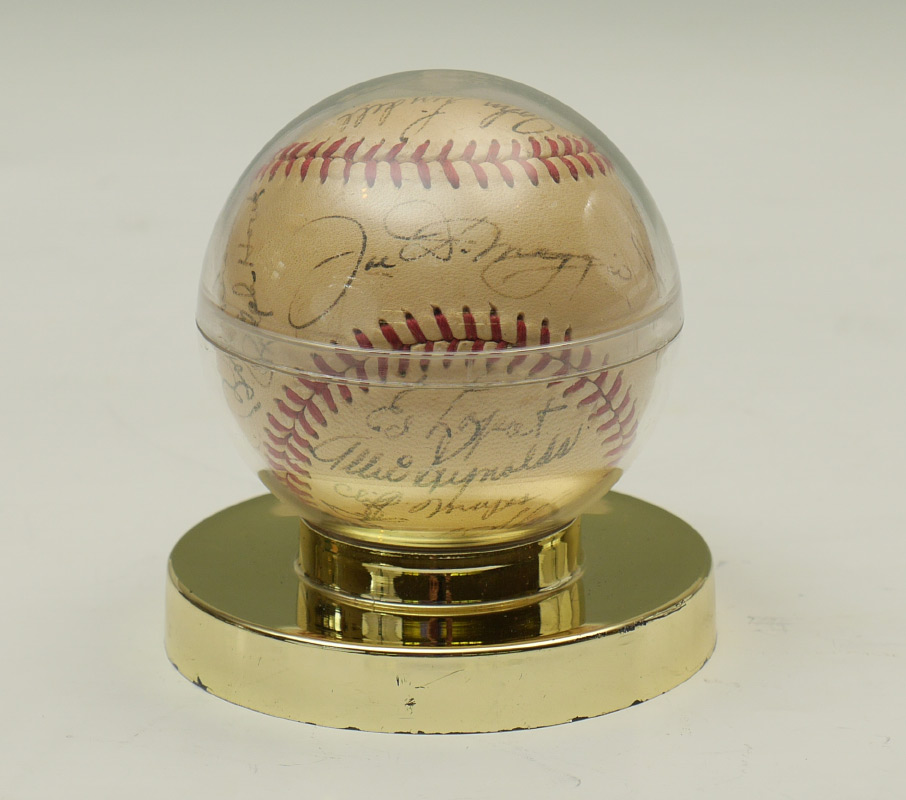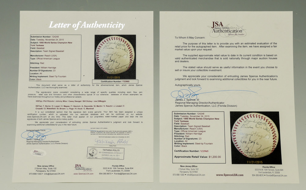 1950 NEW YORK YANKEES TEAM SIGNED BASEBALL: Total of 23 of the World Champion 1950 team, signatures with Hall of Famers to include Joe DiMaggio, Phil Rissuto, Johnny Mize, Casey Stengel and Bill Dickey. Key signatures to include Tommy Byrne, Ed Lopat, Cliff Mapes, Tommy Heinrich, Allie Reynolds, Billy Martin, Vic Raschi, Johnny Lidell, Frank Crosetti, Dick Wakefield, Bobby Brown, Joe Page, Ralph Houk, Cuddles Marsall. Sold with James Spence LOA.