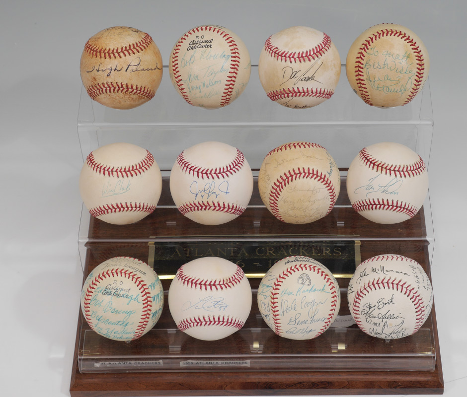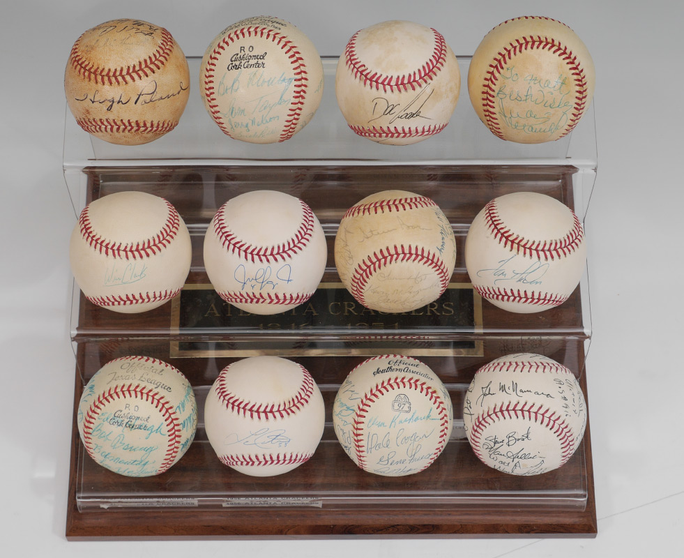COLLECTION OF SOUTHERN ASSOCIATION SIGNED BASEBALLS: 12 baseballs total, some team signed and some individually signed by members of various minor league teams from the Southern Association to include the Atlanta Crackers, New Orleans Pelicans and more, circa 1950's. Nicely displayed in Lexan case, overall measures 9 3/4'' h. x 13'' x 10 1/2''. Comes with the book ''The Crackers'' by Tim Darnell, and a letter from the Southern League offices.