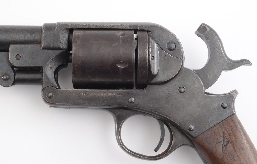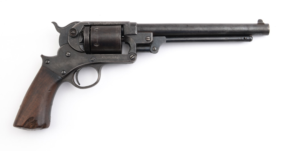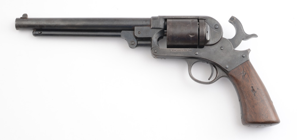 STARR MODEL 1863 SINGLE ACTION CONVERSION PISTOL: Model 1863, converted to 6 shot .44/.45 caliber with firing pin, 8'' round barrel. Standard Starr Arms marking on frame, inspector mark on barrel. Single piece walnut grip, action currently working. Overall measures 14'' long.