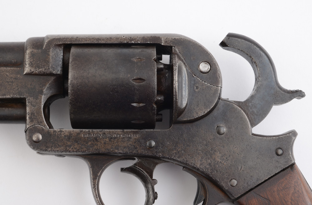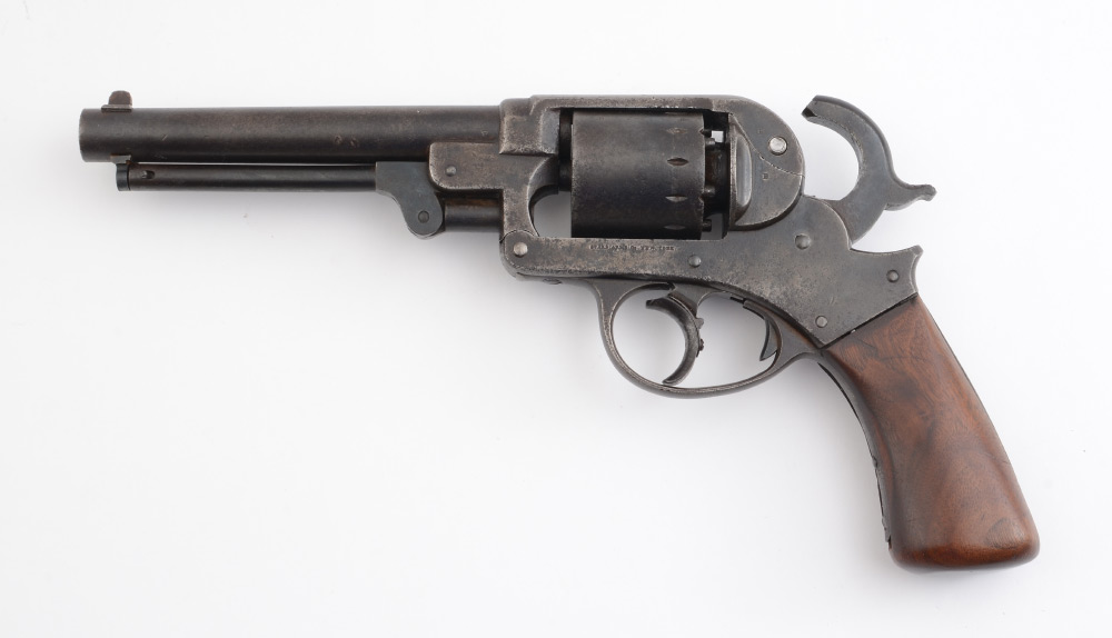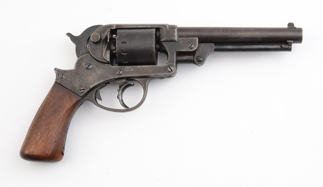 STARR MODEL 1858 DOUBLE ACTION .44 CALIBER REVOLVER: 6 shot cylinder, serial number 18171, 6'' round .44 caliber barrel, frame with standard Starr Arms and inspector marks. Single walnut grip may be replacement, action currently working. Overall 11 1/2'' long.