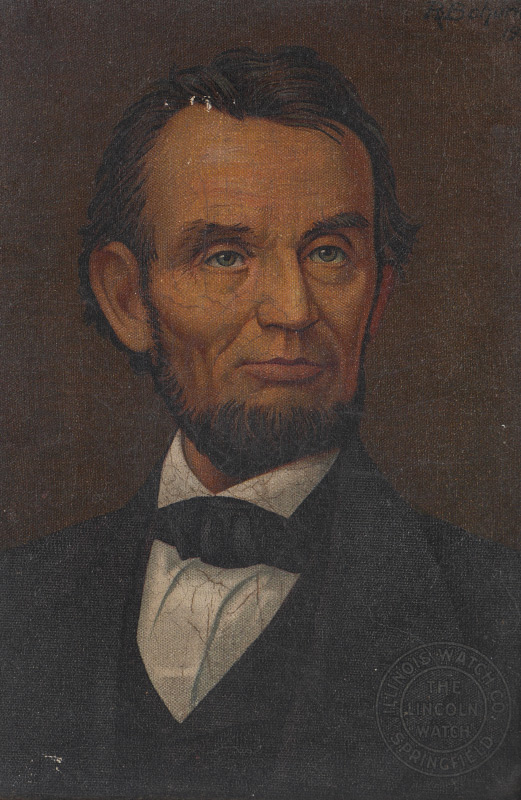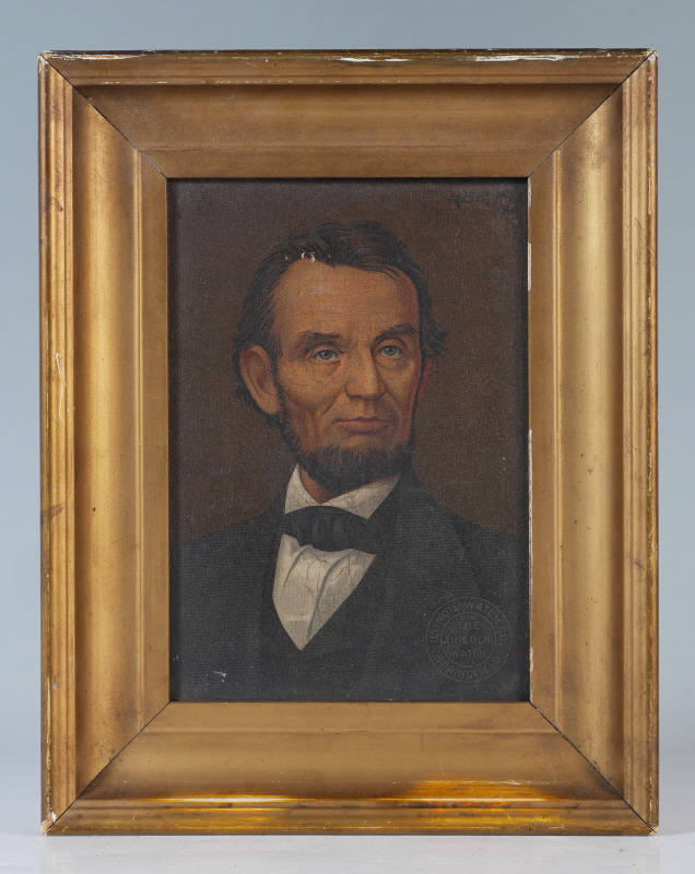 ILLINOIS WATCH CO. LINCOLN ADVERTISEMENT: Advertising lithograph print on canvas of Abraham Lincoln for the Illinois Watch Co. in original gilt frame. Print measures 10'' x 7'', framed 14'' x 11''.