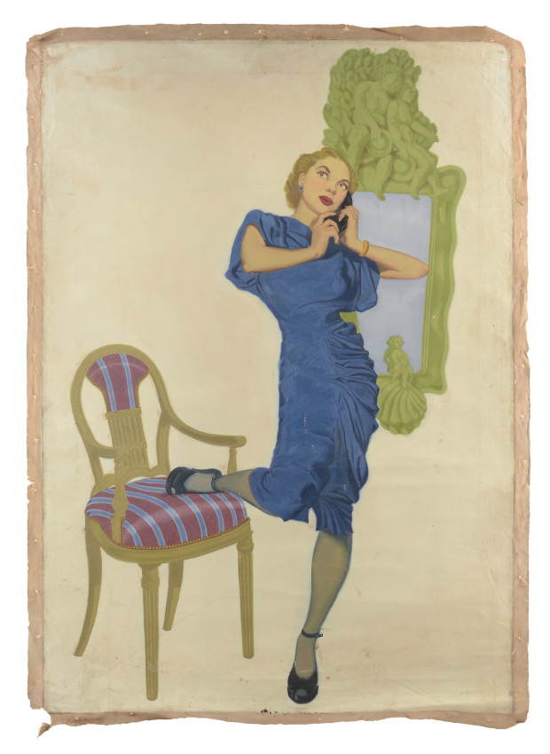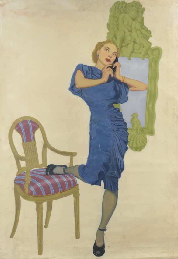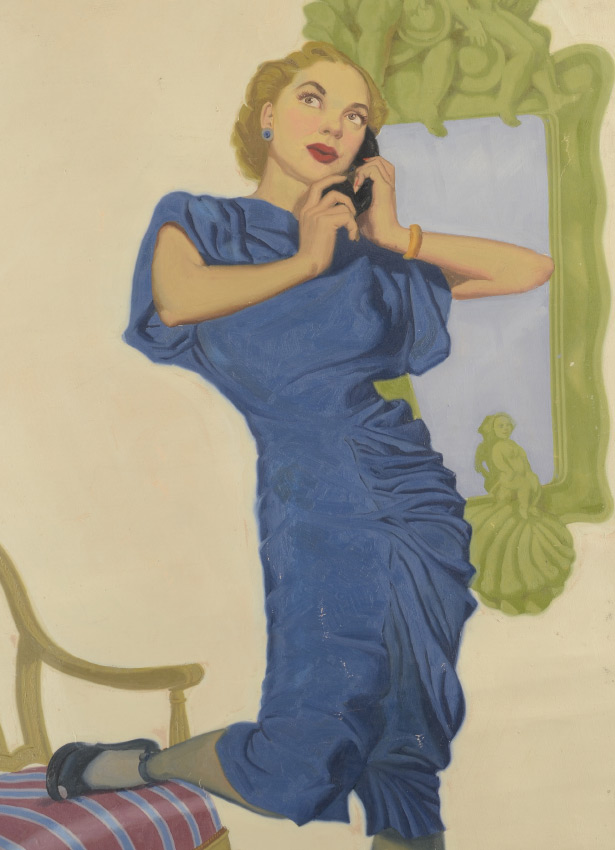 GOOD 1930'S ILLUSTRATION PAINTING OF WOMAN ON THE TELEPHONE: Oil/Unstretched Canvas, image size 31'' x 22.5'', no visible signature, unstretched.