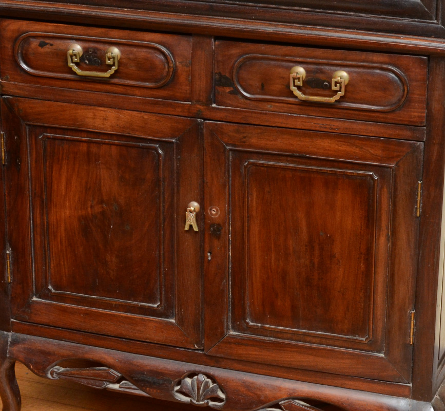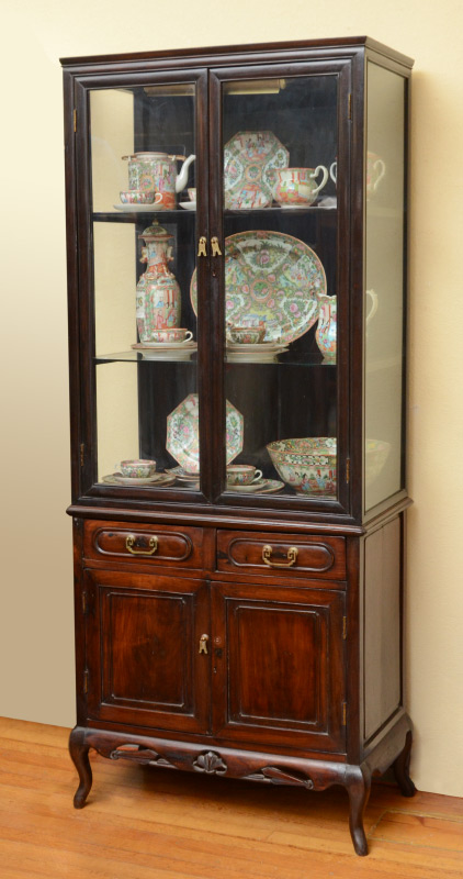 ORIENTAL DISPLAY CABINET: Top with 2 glass doors and sides over 2 half drawers over 2 blind doors, carved skirt, shaped legs. Overall measures 72'' h. x 30'' x 16''.