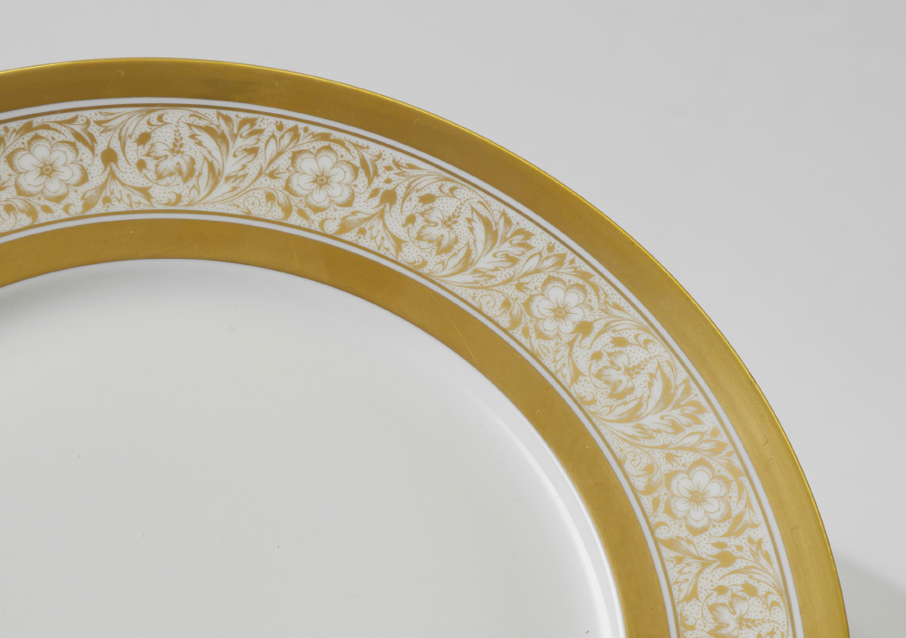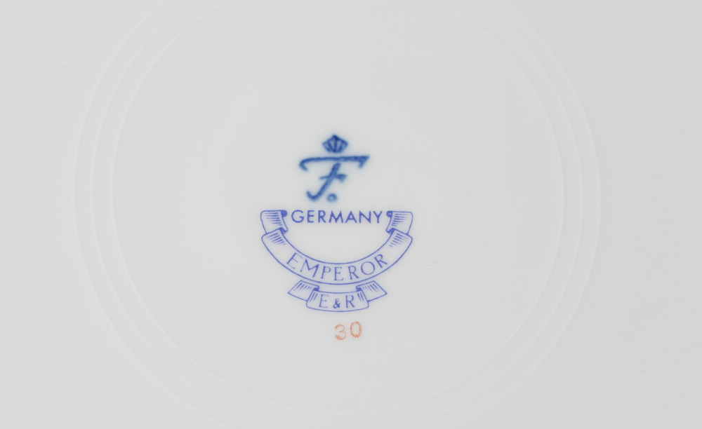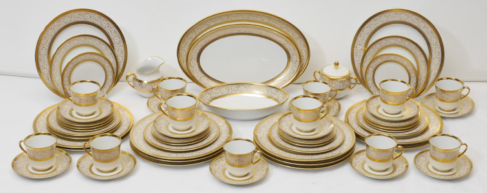 FURSTENBERG EMPEROR FLORAL GILT RIM CHINA SERVICE: Approx. 57 pieces in the ''Emperor'' pattern by Furstenberg to include 12 plates (10 1/2''), 7 salad plates (7 3/4''), 12 bread plates (6''), 10 teacups and 12 saucers, 2 platters, open vegetable, sugar.